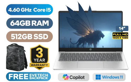 HP Laptop 14-ep0026ni 13th Gen Intel Core i5-1334U up to 4.60GHz Processor, 12MB Cache, 10x Cores, 12x Threads / 64GB DDR4 RAM / 512GB Ultra-Fast NVME SSD / 14" FHD (1920 x 1080) Anti-Glare Display / Integrated Intel Iris Xe Graphics / Windows 11 Home(64bit) / Realtek 8852BE-VT WiFi 6 Wireless LAN / Bluetooth 5.4 / 720p HD camera / 2x USB Type-A / 1x USB Type-C (Supports DisplayPort) / 1x HDMI / 1x Headphone And Microphone Combo Jack / Dual Speakers / HP Laptop 14s-ep0026ni Intel Core i5 LaptopHP Laptop 14-ep0026ni 13th Gen Intel Core i5-1334U up to 4.60GHz Processor, 12MB Cache, 10x Cores, 12x Threads / 64GB DDR4 RAM / 512GB Ultra-Fast NVME SSD / 14" FHD (1920 x 1080) Anti-Glare Display / Integrated Intel Iris Xe Graphics / Windows 11 Home(64bit) / Realtek 8852BE-VT WiFi 6 Wireless LAN / Bluetooth 5.4 / 720p HD camera / 2x USB Type-A / 1x USB Type-C (Supports DisplayPort) / 1x HDMI / 1x Headphone And Microphone Combo Jack / Dual Speakers / HP Laptop 14s-ep0026ni Intel Core i5 Laptop [C92D1EA/64GB] / 3 YEARS WARRANTY / [+] GET FREE EVETECH DASH Premium Gaming Backpack+ FREE DELIVERY !