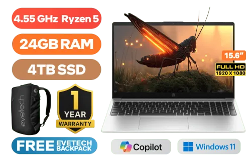 HP Notebook 255R G10 AMD Ryzen 5 7535U up to 4.55GHz Processor, 19MB Cache, 6x Cores, 12x Threads / 24GB DDR5 RAM / 4TB Ultra-Fast NVMe SSD / 15.6" FHD (1920 x 1080) Anti Glare IPS-Level Display / Integrated AMD Graphics / Windows 11 Home / 720P HD Camera / Realtek 8852BE-VT Wi-Fi 6 Wireless LAN / Bluetooth 5.3 / 2x USB Type-A / 1x USB Type-C (USB Power Delivery, DisplayPort 1.4, HP Sleep and Charge) / 1x HDMI / Headphone and Microphone Combo Jack / Non-Backlit Keyboard / HP Notebook 255R G10 Ryzen 5 Laptop DealHP Notebook 255R G10 AMD Ryzen 5 7535U up to 4.55GHz Processor, 19MB Cache, 6x Cores, 12x Threads / 24GB DDR5 RAM / 4TB Ultra-Fast NVMe SSD / 15.6" FHD (1920 x 1080) Anti Glare IPS-Level Display / Integrated AMD Graphics / Windows 11 Home / 720P HD Camera / Realtek 8852BE-VT Wi-Fi 6 Wireless LAN / Bluetooth 5.3 / 2x USB Type-A / 1x USB Type-C (USB Power Delivery, DisplayPort 1.4, HP Sleep and Charge) / 1x HDMI / Headphone and Microphone Combo Jack / Non-Backlit Keyboard / HP Notebook 255R G10 Ryzen 5 Laptop Deal [D0ML5AT/24GB/4TB] / [+] GET FREE EVETECH NEO Premium Gaming Backpack+ FREE DELIVERY !