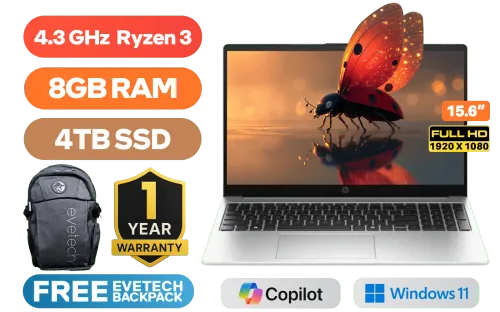 HP Notebook 255R G10 AMD Ryzen 3 7335U up to 4.3GHz Processor, 10MB Cache, 4x Cores, 8x Threads / 8GB DDR5 RAM / 4TB Ultra-Fast NVMe SSD / 15.6" FHD (1920 x 1080) Anti Glare IPS-Level Display / Integrated AMD Graphics / Windows 11 Home / 720P HD Camera / Realtek 8852BE-VT Wi-Fi 6 Wireless LAN / Bluetooth 5.3 / 2x USB Type-A / 1x USB Type-C (USB Power Delivery, DisplayPort 1.4, HP Sleep and Charge) / 1x HDMI / Headphone and Microphone Combo Jack / Non-Backlit Keyboard / HP Notebook 255R G10 Ryzen 3 Laptop DealHP Notebook 255R G10 AMD Ryzen 3 7335U up to 4.3GHz Processor, 10MB Cache, 4x Cores, 8x Threads / 8GB DDR5 RAM / 4TB Ultra-Fast NVMe SSD / 15.6" FHD (1920 x 1080) Anti Glare IPS-Level Display / Integrated AMD Graphics / Windows 11 Home / 720P HD Camera / Realtek 8852BE-VT Wi-Fi 6 Wireless LAN / Bluetooth 5.3 / 2x USB Type-A / 1x USB Type-C (USB Power Delivery, DisplayPort 1.4, HP Sleep and Charge) / 1x HDMI / Headphone and Microphone Combo Jack / Non-Backlit Keyboard / HP Notebook 255R G10 Ryzen 3 Laptop Deal [D0ML8AT/4TB] / [+] GET FREE EVETECH FLUX Premium Gaming Backpack+ FREE DELIVERY !