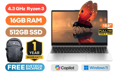 HP Notebook 255R G10 AMD Ryzen 3 7335U up to 4.3GHz Processor, 10MB Cache, 4x Cores, 8x Threads / 16GB DDR5 RAM / 512GB Ultra-Fast NVMe SSD / 15.6" FHD (1920 x 1080) Anti Glare IPS-Level Display / Integrated AMD Graphics / Windows 11 Home / 720P HD Camera / Realtek 8852BE-VT Wi-Fi 6 Wireless LAN / Bluetooth 5.3 / 2x USB Type-A / 1x USB Type-C (USB Power Delivery, DisplayPort 1.4, HP Sleep and Charge) / 1x HDMI / Headphone and Microphone Combo Jack / Non-Backlit Keyboard / HP Notebook 255R G10 Ryzen 3 Laptop DealHP Notebook 255R G10 AMD Ryzen 3 7335U up to 4.3GHz Processor, 10MB Cache, 4x Cores, 8x Threads / 16GB DDR5 RAM / 512GB Ultra-Fast NVMe SSD / 15.6" FHD (1920 x 1080) Anti Glare IPS-Level Display / Integrated AMD Graphics / Windows 11 Home / 720P HD Camera / Realtek 8852BE-VT Wi-Fi 6 Wireless LAN / Bluetooth 5.3 / 2x USB Type-A / 1x USB Type-C (USB Power Delivery, DisplayPort 1.4, HP Sleep and Charge) / 1x HDMI / Headphone and Microphone Combo Jack / Non-Backlit Keyboard / HP Notebook 255R G10 Ryzen 3 Laptop Deal [D0ML8AT/16GB] / [+] GET FREE EVETECH FLUX Premium Gaming Backpack+ FREE DELIVERY !