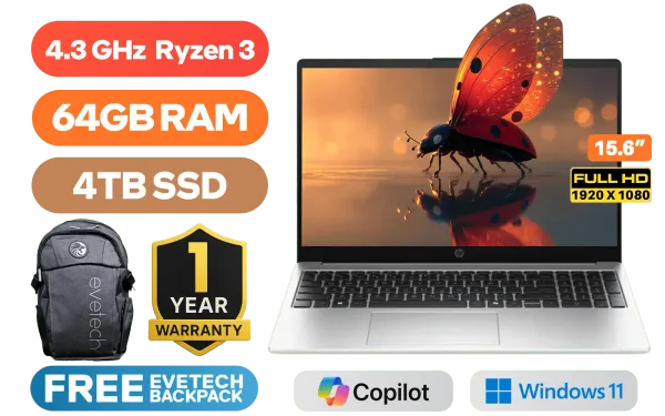 HP Notebook 255R G10 AMD Ryzen 3 7335U up to 4.3GHz Processor, 10MB Cache, 4x Cores, 8x Threads / 64GB DDR5 RAM / 4TB Ultra-Fast NVMe SSD / 15.6" FHD (1920 x 1080) Anti Glare IPS-Level Display / Integrated AMD Graphics / Windows 11 Home / 720P HD Camera / Realtek 8852BE-VT Wi-Fi 6 Wireless LAN / Bluetooth 5.3 / 2x USB Type-A / 1x USB Type-C (USB Power Delivery, DisplayPort 1.4, HP Sleep and Charge) / 1x HDMI / Headphone and Microphone Combo Jack / Non-Backlit Keyboard / HP Notebook 255R G10 Ryzen 3 Laptop DealHP Notebook 255R G10 AMD Ryzen 3 7335U up to 4.3GHz Processor, 10MB Cache, 4x Cores, 8x Threads / 64GB DDR5 RAM / 4TB Ultra-Fast NVMe SSD / 15.6" FHD (1920 x 1080) Anti Glare IPS-Level Display / Integrated AMD Graphics / Windows 11 Home / 720P HD Camera / Realtek 8852BE-VT Wi-Fi 6 Wireless LAN / Bluetooth 5.3 / 2x USB Type-A / 1x USB Type-C (USB Power Delivery, DisplayPort 1.4, HP Sleep and Charge) / 1x HDMI / Headphone and Microphone Combo Jack / Non-Backlit Keyboard / HP Notebook 255R G10 Ryzen 3 Laptop Deal [D0ML8AT/64GB/4TB] / [+] GET FREE EVETECH FLUX Premium Gaming Backpack+ FREE DELIVERY !