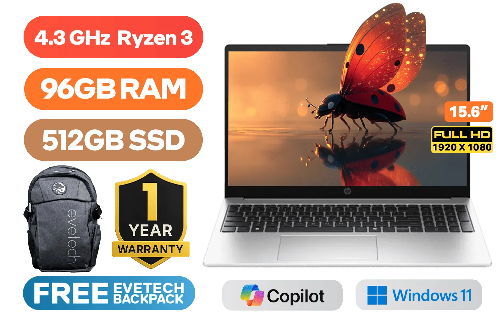HP Notebook 255R G10 AMD Ryzen 3 7335U up to 4.3GHz Processor, 10MB Cache, 4x Cores, 8x Threads / 96GB DDR5 RAM / 512GB Ultra-Fast NVMe SSD / 15.6" FHD (1920 x 1080) Anti Glare IPS-Level Display / Integrated AMD Graphics / Windows 11 Home / 720P HD Camera / Realtek 8852BE-VT Wi-Fi 6 Wireless LAN / Bluetooth 5.3 / 2x USB Type-A / 1x USB Type-C (USB Power Delivery, DisplayPort 1.4, HP Sleep and Charge) / 1x HDMI / Headphone and Microphone Combo Jack / Non-Backlit Keyboard / HP Notebook 255R G10 Ryzen 3 Laptop DealHP Notebook 255R G10 AMD Ryzen 3 7335U up to 4.3GHz Processor, 10MB Cache, 4x Cores, 8x Threads / 96GB DDR5 RAM / 512GB Ultra-Fast NVMe SSD / 15.6" FHD (1920 x 1080) Anti Glare IPS-Level Display / Integrated AMD Graphics / Windows 11 Home / 720P HD Camera / Realtek 8852BE-VT Wi-Fi 6 Wireless LAN / Bluetooth 5.3 / 2x USB Type-A / 1x USB Type-C (USB Power Delivery, DisplayPort 1.4, HP Sleep and Charge) / 1x HDMI / Headphone and Microphone Combo Jack / Non-Backlit Keyboard / HP Notebook 255R G10 Ryzen 3 Laptop Deal [D0ML8AT/96GB] / [+] GET FREE EVETECH FLUX Premium Gaming Backpack+ FREE DELIVERY !