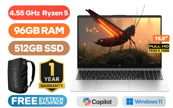 HP Notebook 255R G10 AMD Ryzen 5 7535U up to 4.55GHz Processor, 19MB Cache, 6x Cores, 12x Threads / 96GB DDR5 RAM / 512GB Ultra-Fast NVMe SSD / 15.6" FHD (1920 x 1080) Anti Glare IPS-Level Display / Integrated AMD Graphics / Windows 11 Home / 720P HD Camera / Realtek 8852BE-VT Wi-Fi 6 Wireless LAN / Bluetooth 5.3 / 2x USB Type-A / 1x USB Type-C (USB Power Delivery, DisplayPort 1.4, HP Sleep and Charge) / 1x HDMI / Headphone and Microphone Combo Jack / Non-Backlit Keyboard / HP Notebook 255R G10 Ryzen 5 Laptop DealHP Notebook 255R G10 AMD Ryzen 5 7535U up to 4.55GHz Processor, 19MB Cache, 6x Cores, 12x Threads / 96GB DDR5 RAM / 512GB Ultra-Fast NVMe SSD / 15.6" FHD (1920 x 1080) Anti Glare IPS-Level Display / Integrated AMD Graphics / Windows 11 Home / 720P HD Camera / Realtek 8852BE-VT Wi-Fi 6 Wireless LAN / Bluetooth 5.3 / 2x USB Type-A / 1x USB Type-C (USB Power Delivery, DisplayPort 1.4, HP Sleep and Charge) / 1x HDMI / Headphone and Microphone Combo Jack / Non-Backlit Keyboard / HP Notebook 255R G10 Ryzen 5 Laptop Deal [D0ML5AT/96GB] / [+] GET FREE EVETECH NEO Premium Gaming Backpack+ FREE DELIVERY !