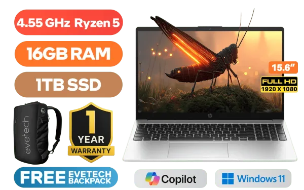 HP Notebook 255R G10 AMD Ryzen 5 7535U up to 4.55GHz Processor, 19MB Cache, 6x Cores, 12x Threads / 16GB DDR5 RAM / 1TB Ultra-Fast NVMe SSD / 15.6" FHD (1920 x 1080) Anti Glare IPS-Level Display / Integrated AMD Graphics / Windows 11 Home / 720P HD Camera / Realtek 8852BE-VT Wi-Fi 6 Wireless LAN / Bluetooth 5.3 / 2x USB Type-A / 1x USB Type-C (USB Power Delivery, DisplayPort 1.4, HP Sleep and Charge) / 1x HDMI / Headphone and Microphone Combo Jack / Non-Backlit Keyboard / HP Notebook 255R G10 Ryzen 5 Laptop DealHP Notebook 255R G10 AMD Ryzen 5 7535U up to 4.55GHz Processor, 19MB Cache, 6x Cores, 12x Threads / 16GB DDR5 RAM / 1TB Ultra-Fast NVMe SSD / 15.6" FHD (1920 x 1080) Anti Glare IPS-Level Display / Integrated AMD Graphics / Windows 11 Home / 720P HD Camera / Realtek 8852BE-VT Wi-Fi 6 Wireless LAN / Bluetooth 5.3 / 2x USB Type-A / 1x USB Type-C (USB Power Delivery, DisplayPort 1.4, HP Sleep and Charge) / 1x HDMI / Headphone and Microphone Combo Jack / Non-Backlit Keyboard / HP Notebook 255R G10 Ryzen 5 Laptop Deal [D0ML5AT/1TB] / [+] GET FREE EVETECH NEO Premium Gaming Backpack+ FREE DELIVERY !