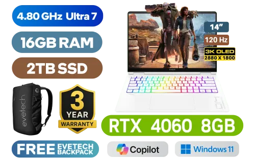 OMEN by HP Laptop 14-fb0008ni Intel® Core™ Ultra 7 -155H up to 4.80GHz Processor, 24MB Cache, 16x Cores, 22x Threads / 16GB LPDDR5X RAM / 2TB Ultra-Fast NVME SSD / 14" 3k OLED (2880 x 1800) 120Hz Refresh Rate With IPS-Level micro-edge Display / NVIDIA GeForce RTX 4060 8GB GDDR6 Dedicated Graphics / Windows 11 Home (64bit) / Intel Wi-Fi 7 BE200 Wireless LAN / Bluetooth 5.4 / HP Wide Vision 1080p FHD camera with temporal noise reduction and integrated dual array digital microphones / 2x USB Type-A / 2x USB Type-C / 1x HDMI 2.1 / 1x Headphone and Microphone Combo Jack / RGB Backlit Keyboard / Audio by HyperX; DTS:X® Ultra; Dual speakers; HP Audio Boost / HP OMEN 14 Core Ultra 7 RTX 4060 Gaming Laptop DealOMEN by HP Laptop 14-fb0008ni Intel® Core™ Ultra 7 -155H up to 4.80GHz Processor, 24MB Cache, 16x Cores, 22x Threads / 16GB LPDDR5X RAM / 2TB Ultra-Fast NVME SSD / 14" 3k OLED (2880 x 1800) 120Hz Refresh Rate With IPS-Level micro-edge Display / NVIDIA GeForce RTX 4060 8GB GDDR6 Dedicated Graphics / Windows 11 Home (64bit) / Intel Wi-Fi 7 BE200 Wireless LAN / Bluetooth 5.4 / HP Wide Vision 1080p FHD camera with temporal noise reduction and integrated dual array digital microphones / 2x USB Type-A / 2x USB Type-C / 1x HDMI 2.1 / 1x Headphone and Microphone Combo Jack / RGB Backlit Keyboard / Audio by HyperX; DTS:X® Ultra; Dual speakers; HP Audio Boost / HP OMEN 14 Core Ultra 7 RTX 4060 Gaming Laptop Deal [B20ZMEA/2TB] / 3 YEARS WARRANTY / [+] GET FREE EVETECH NEO Premium Gaming Backpack+ FREE DELIVERY !