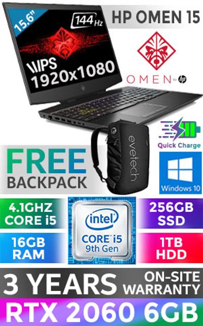 HP OMEN 15-dh0010ni 9th Gen Intel Core i5-9300H up to 4.10GHz Processor with Intel Turbo Boost Technology, 8MB Cache, 4x Cores, 8x Threads / 16GB DDR4 RAM / 256GB Ultra-Fast NVME SSD + 1TB Hard Drive / 15.6" FHD IPS 1920x1080 Anti-Glare ULTRA-RESPONSIVE 144Hz Micro-edge Slim-Bazel Display / NVIDIA 20 Series GeForce RTX 2060 6GB GDDR6 Graphics With Desktop Level Performance / Intel Dual Band 9560 AC Wireless LAN / Bluetooth 5 / HP Wide Vision HD Camera with Integrated Dual Array Digital Microphone / Windows 10 Home 64bit / 3x USB 3.1 Type-A / 1x USB 3.1 Type-C with Thunderbolt™ 3 (DisplayPort™ 1.4) / 1x HDMI / 1x Mini DisplayPort / 1x Audio In And Out Combo Jack / Integrated GbE LAN / 1x Multi-format SD Card Reader / No DVD Drive Included / Full-Size Island Style white Legend 4-zone RGB Backlit keyboard / Bang & Olufsen, Dual speakers, HP Audio Boost, Omen Audio Control Support DTS:X® Ultra / Touchpad with multi-touch Gesture Support / 3 YEAR ON-SITE WARRANTY / Supports battery fast charge: approximately 50% in 45 minutes / HP OMEN 15 Core i5 RTX 2060 Gaming Laptop DealHP OMEN 15-dh0010ni 9th Gen Intel Core i5-9300H up to 4.10GHz Processor with Intel Turbo Boost Technology, 8MB Cache, 4x Cores, 8x Threads / 16GB DDR4 RAM / 256GB Ultra-Fast NVME SSD + 1TB Hard Drive / 15.6" FHD IPS 1920x1080 Anti-Glare ULTRA-RESPONSIVE 144Hz Micro-edge Slim-Bazel Display / NVIDIA 20 Series GeForce RTX 2060 6GB GDDR6 Graphics With Desktop Level Performance / Intel Dual Band 9560 AC Wireless LAN / Bluetooth 5 / HP Wide Vision HD Camera with Integrated Dual Array Digital Microphone / Windows 10 Home 64bit / 3x USB 3.1 Type-A / 1x USB 3.1 Type-C with Thunderbolt™ 3 (DisplayPort™ 1.4) / 1x HDMI / 1x Mini DisplayPort / 1x Audio In And Out Combo Jack / Integrated GbE LAN / 1x Multi-format SD Card Reader / No DVD Drive Included / Full-Size Island Style white Legend 4-zone RGB Backlit keyboard / Bang & Olufsen, Dual speakers, HP Audio Boost, Omen Audio Control Support DTS:X® Ultra / Touchpad with multi-touch Gesture Support / 3 YEAR ON-SITE WARRANTY / Supports battery fast charge: approximately 50% in 45 minutes / HP OMEN 15 Core i5 RTX 2060 Gaming Laptop Deal [7EA79EA] / [+] GET FREE EVETECH NEO Premium Gaming Backpack+ FREE DELIVERY !