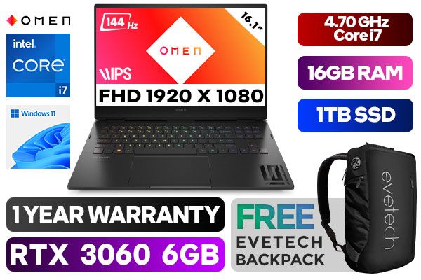 OMEN by HP Laptop 16-k0003ni 12th Gen Intel Core i7-12700H up to 4.70GHz Processor, 24MB Cache, 14x Cores, 20x Threads / 16GB DDR5 RAM / 1TB Ultra-Fast NVME SSD / 16.1" FHD 1920x1080 Anti-glare 144Hz Refresh Rate With IPS-Level micro-edge Display / NVIDIA 30 Series GeForce RTX 3060 6GB GDDR6 Dedicated Graphics / Windows 11 Home (64bit) / Wi-Fi 6E Wireless LAN / Bluetooth 5.2 / HP Wide Vision 720p HD camera with temporal noise reduction and integrated dual array digital microphones / 3x SuperSpeed USB Type-A / 2x USB4 Type-C with Thunderbolt 4 / 1x HDMI 2.1 / 1x Headphone and Microphone Combo Jack / Integrated GbE LAN / 1x Multi-format SD Card Reader / No DVD Drive Included / <span style="font-size: 20px; color: rgb(255, 0, 0);">R</span><span style="font-size: 20px; color: rgb(51, 153, 0);">G</span><span style="font-size: 20px; color: rgb(51, 102, 255);">B</span></span> Backlit Keyboard / Bang & Olufsen, dual speakers, HP Audio Boost, DTS Headphone:X™ / 1 Year Warranty / HP OMEN 16 6E1G3EA 12th Gen Core i7 RTX 3060 Gaming Laptop DealOMEN by HP Laptop 16-k0003ni 12th Gen Intel Core i7-12700H up to 4.70GHz Processor, 24MB Cache, 14x Cores, 20x Threads / 16GB DDR5 RAM / 1TB Ultra-Fast NVME SSD / 16.1" FHD 1920x1080 Anti-glare 144Hz Refresh Rate With IPS-Level micro-edge Display / NVIDIA 30 Series GeForce RTX 3060 6GB GDDR6 Dedicated Graphics / Windows 11 Home (64bit) / Wi-Fi 6E Wireless LAN / Bluetooth 5.2 / HP Wide Vision 720p HD camera with temporal noise reduction and integrated dual array digital microphones / 3x SuperSpeed USB Type-A / 2x USB4 Type-C with Thunderbolt 4 / 1x HDMI 2.1 / 1x Headphone and Microphone Combo Jack / Integrated GbE LAN / 1x Multi-format SD Card Reader / No DVD Drive Included / RGB Backlit Keyboard / Bang & Olufsen, dual speakers, HP Audio Boost, DTS Headphone:X™ / 1 Year Warranty / HP OMEN 16 6E1G3EA 12th Gen Core i7 RTX 3060 Gaming Laptop Deal [6E1G3EA/1TB] / [+] GET FREE EVETECH NEO Premium Gaming Backpack+ FREE DELIVERY !