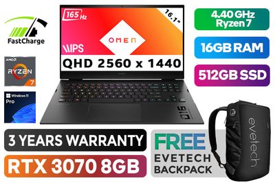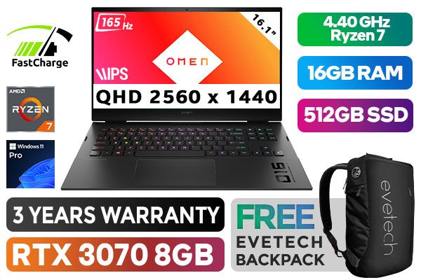HP OMEN 16-c0007ni AMD Ryzen 7 5800H up to 4.40GHz Processor, 20MB Cache, 8x Cores, 16x Threads / 16GB DDR4 RAM / 512GB Ultra-Fast NVME SSD / 16.1" QHD 2560x1440 Anti-glare 165Hz Refresh Rate With IPS-Level micro-edge Display / NVIDIA 30 Series GeForce RTX 3070 8GB GDDR6 Desktop Level Graphics / <span style="color:blue; font-size:18px;">Windows 11 Professional (64bit)</span> / Dual Band Wi-Fi 6 AX 210 Wireless LAN / Bluetooth 5.2 / HP Wide Vision 720p Camera with Integrated Dual Array Digital Microphone / 3x SuperSpeed USB Type-A / 1x SuperSpeed USB Type-C / 1x Mini DisplayPort / 1x HDMI 2.1 / 1x Headphone and Microphone Combo Jack / Integrated GbE LAN / 1x Multi-format SD Card Reader / No DVD Drive Included / 4-zone <span style="font-size: 20px; color: rgb(255, 0, 0);">R</span><span style="font-size: 20px; color: rgb(51, 153, 0);">G</span><span style="font-size: 20px; color: rgb(51, 102, 255);">B</span></span> backlit Shadow Black Keyboard / Bang & Olufsen, dual speakers, HP Audio Boost, DTS Headphone:X™ / Up to 5 Hours Battery Life / Supports battery fast charge: approximately 50% in 45 minutes / HP OMEN 16 Ryzen 7 RTX 3070 Laptop 4V5T3EA Gaming Laptop DealHP OMEN 16-c0007ni AMD Ryzen 7 5800H up to 4.40GHz Processor, 20MB Cache, 8x Cores, 16x Threads / 16GB DDR4 RAM / 512GB Ultra-Fast NVME SSD / 16.1" QHD 2560x1440 Anti-glare 165Hz Refresh Rate With IPS-Level micro-edge Display / NVIDIA 30 Series GeForce RTX 3070 8GB GDDR6 Desktop Level Graphics / Windows 11 Professional (64bit) / Dual Band Wi-Fi 6 AX 210 Wireless LAN / Bluetooth 5.2 / HP Wide Vision 720p Camera with Integrated Dual Array Digital Microphone / 3x SuperSpeed USB Type-A / 1x SuperSpeed USB Type-C / 1x Mini DisplayPort / 1x HDMI 2.1 / 1x Headphone and Microphone Combo Jack / Integrated GbE LAN / 1x Multi-format SD Card Reader / No DVD Drive Included / 4-zone RGB backlit Shadow Black Keyboard / Bang & Olufsen, dual speakers, HP Audio Boost, DTS Headphone:X™ / Up to 5 Hours Battery Life / Supports battery fast charge: approximately 50% in 45 minutes / HP OMEN 16 Ryzen 7 RTX 3070 Laptop 4V5T3EA Gaming Laptop Deal [4V5T3EA] / 3 YEARS WARRANTY / [+] GET FREE EVETECH NEO Premium Gaming Backpack+ FREE DELIVERY !