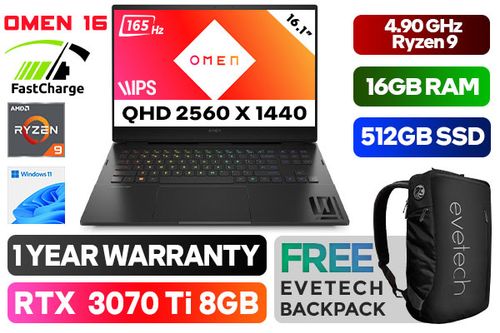 OMEN by HP Laptop 16-n0000ni AMD Ryzen 9-6900HX up to 4.9GHz Processor, 20MB Cache, 8x Cores, 16x Threads / 16GB DDR5 RAM / 512GB Ultra-Fast NVME SSD / 16.1" QHD 2560x1440 Anti-glare 165Hz Refresh Rate With IPS-Level micro-edge Display / NVIDIA 30 Series GeForce RTX 3070 Ti 8GB GDDR6 Desktop Level Graphics / Windows 11 Home (64bit) / MediaTek Wi-Fi 6 MT7922 Wireless LAN / Bluetooth 5.2 / HP Wide Vision 720p HD camera with temporal noise reduction and integrated dual array digital microphones / 3x SuperSpeed USB Type-A / 2x USB Type-C with DisplayPort 1.4 / 1x HDMI 2.1 / 1x Headphone and Microphone Combo Jack / Integrated GbE LAN / 1x Multi-format SD Card Reader / No DVD Drive Included / <span style="font-size: 20px; color: rgb(255, 0, 0);">R</span><span style="font-size: 20px; color: rgb(51, 153, 0);">G</span><span style="font-size: 20px; color: rgb(51, 102, 255);">B</span></span> Backlit Keyboard / Bang & Olufsen, dual speakers, HP Audio Boost, DTS Headphone:X™ / Supports battery fast charge: approximately 50% in 30 minutes / 1 Year Warranty / HP OMEN 16 6G108EA Ryzen 9 RTX 3070 Ti Gaming Laptop DealOMEN by HP Laptop 16-n0000ni AMD Ryzen 9-6900HX up to 4.9GHz Processor, 20MB Cache, 8x Cores, 16x Threads / 16GB DDR5 RAM / 512GB Ultra-Fast NVME SSD / 16.1" QHD 2560x1440 Anti-glare 165Hz Refresh Rate With IPS-Level micro-edge Display / NVIDIA 30 Series GeForce RTX 3070 Ti 8GB GDDR6 Desktop Level Graphics / Windows 11 Home (64bit) / MediaTek Wi-Fi 6 MT7922 Wireless LAN / Bluetooth 5.2 / HP Wide Vision 720p HD camera with temporal noise reduction and integrated dual array digital microphones / 3x SuperSpeed USB Type-A / 2x USB Type-C with DisplayPort 1.4 / 1x HDMI 2.1 / 1x Headphone and Microphone Combo Jack / Integrated GbE LAN / 1x Multi-format SD Card Reader / No DVD Drive Included / RGB Backlit Keyboard / Bang & Olufsen, dual speakers, HP Audio Boost, DTS Headphone:X™ / Supports battery fast charge: approximately 50% in 30 minutes / 1 Year Warranty / HP OMEN 16 6G108EA Ryzen 9 RTX 3070 Ti Gaming Laptop Deal [6G108EA] / [+] GET FREE EVETECH NEO Premium Gaming Backpack+ FREE DELIVERY !