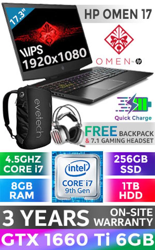 HP OMEN 17-cb0009ni 9th Gen Intel Core i7-9750H up to 4.5GHz Processor, 12MB Cache, 6x Cores, 12x Threads / 8GB DDR4 RAM / 256GB Ultra-Fast NVME SSD + 1TB Hard Drive / 17.3" FHD IPS 1920x1080 Anti-Glare Micro-edge Slim-Bazel Display / NVIDIA GeForce GTX 1660 Ti 6GB GDDR6 Graphics With Desktop Level Performance / Intel Dual Band 9560 802.11ac Wireless LAN / Bluetooth 5 / HP Wide Vision HD Camera with Integrated Dual Array Digital Microphone / Windows 10 Home 64bit / 3x USB 3.1 Type-A / 1x USB 3.1 Type-C with Thunderbolt™ 3 (DisplayPort™ 1.4) / 1x HDMI / 1x Mini DisplayPort / 1x Audio In And Out Combo Jack / Integrated GbE LAN / 1x Multi-format SD Card Reader / No DVD Drive Included / Full-Size Island Style white Legend 4-zone <span style="font-size: 20px; color: rgb(255, 0, 0);">R</span><span style="font-size: 20px; color: rgb(51, 153, 0);">G</span><span style="font-size: 20px; color: rgb(51, 102, 255);">B</span> Backlit keyboard / Bang & Olufsen, Dual speakers, HP Audio Boost Omen Audio Control Support DTS:X® Ultra / Touchpad with multi-touch Gesture Support / <span style="font-size:18px; color:red;">3 YEAR ON-SITE WARRANTY</span> / Supports battery fast charge: approximately 50% in 45 minutes / HP OMEN Core i7 GTX 1660 Ti Gaming Laptop DealHP OMEN 17-cb0009ni 9th Gen Intel Core i7-9750H up to 4.5GHz Processor, 12MB Cache, 6x Cores, 12x Threads / 8GB DDR4 RAM / 256GB Ultra-Fast NVME SSD + 1TB Hard Drive / 17.3" FHD IPS 1920x1080 Anti-Glare Micro-edge Slim-Bazel Display / NVIDIA GeForce GTX 1660 Ti 6GB GDDR6 Graphics With Desktop Level Performance / Intel Dual Band 9560 802.11ac Wireless LAN / Bluetooth 5 / HP Wide Vision HD Camera with Integrated Dual Array Digital Microphone / Windows 10 Home 64bit / 3x USB 3.1 Type-A / 1x USB 3.1 Type-C with Thunderbolt™ 3 (DisplayPort™ 1.4) / 1x HDMI / 1x Mini DisplayPort / 1x Audio In And Out Combo Jack / Integrated GbE LAN / 1x Multi-format SD Card Reader / No DVD Drive Included / Full-Size Island Style white Legend 4-zone RGB Backlit keyboard / Bang & Olufsen, Dual speakers, HP Audio Boost Omen Audio Control Support DTS:X® Ultra / Touchpad with multi-touch Gesture Support / 3 YEAR ON-SITE WARRANTY / Supports battery fast charge: approximately 50% in 45 minutes / HP OMEN Core i7 GTX 1660 Ti Gaming Laptop Deal [7DW71EA] / [+] GET FREE EVETECH NEO Premium Gaming Backpack+ FREE DELIVERY !