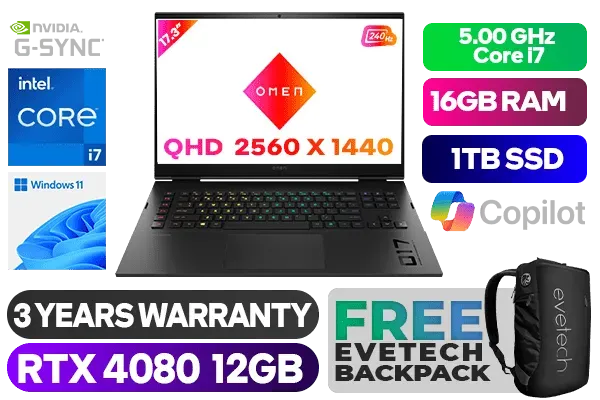 OMEN by HP Laptop 17-ck2001ni 13th Gen Intel Core i7-13700HX up to 5.00GHz Processor, 30MB Cache, 16x Cores, 24x Threads / 16GB DDR5 RAM / 1TB Ultra-Fast NVME SSD / 17.3" QHD 2560x1440 Anti-glare 240Hz Refresh Rate With IPS-Level G-sync Display / NVIDIA 40 Series GeForce RTX 4080 12GB GDDR6 Graphics With Desktop Level Performance / Windows 11 Home (64bit) / Intel Dual Band Wi-Fi 6 AX 211 Wireless LAN / Bluetooth 5.3 / HP Wide Vision 720p HD camera with temporal noise reduction and integrated dual array digital microphones / 3x USB 3.1 Type-A / 1x USB 3.1 Type-C with Thunderbolt 4 / 1x Mini DisplayPort / 1x HDMI 2.0 / 1x Headphone and Microphone Combo Jack / Integrated GbE LAN / 1x Multi-format SD Card Reader / No DVD Drive Included / RGB Backlit Keyboard / Audio by Bang & Olufsen; DTS:X® Ultra; Dual speakers; HP Audio Boost / HP OMEN 17 Core i7 RTX 4080 Gaming Laptop 7Z8U7EA DealOMEN by HP Laptop 17-ck2001ni 13th Gen Intel Core i7-13700HX up to 5.00GHz Processor, 30MB Cache, 16x Cores, 24x Threads / 16GB DDR5 RAM / 1TB Ultra-Fast NVME SSD / 17.3" QHD 2560x1440 Anti-glare 240Hz Refresh Rate With IPS-Level G-sync Display / NVIDIA 40 Series GeForce RTX 4080 12GB GDDR6 Graphics With Desktop Level Performance / Windows 11 Home (64bit) / Intel Dual Band Wi-Fi 6 AX 211 Wireless LAN / Bluetooth 5.3 / HP Wide Vision 720p HD camera with temporal noise reduction and integrated dual array digital microphones / 3x USB 3.1 Type-A / 1x USB 3.1 Type-C with Thunderbolt 4 / 1x Mini DisplayPort / 1x HDMI 2.0 / 1x Headphone and Microphone Combo Jack / Integrated GbE LAN / 1x Multi-format SD Card Reader / No DVD Drive Included / RGB Backlit Keyboard / Audio by Bang & Olufsen; DTS:X® Ultra; Dual speakers; HP Audio Boost / HP OMEN 17 Core i7 RTX 4080 Gaming Laptop 7Z8U7EA Deal [7Z8U7EA] / 3 YEARS WARRANTY / [+] GET FREE EVETECH NEO Premium Gaming Backpack+ FREE DELIVERY !