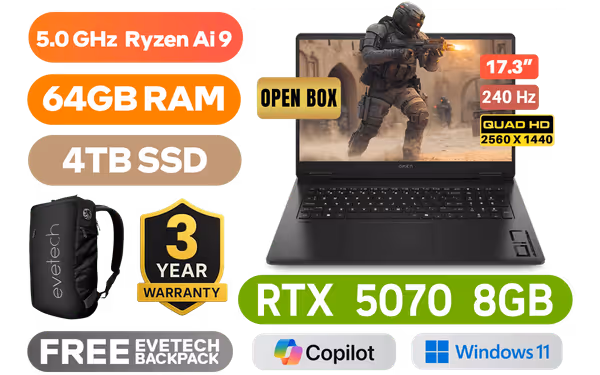 [OPEN BOX] HP OMEN Gaming Laptop 17-db1005ni AMD Ryzen AI 9 365 up to 5.0GHz Processor, 34MB Cache, 10x Cores, 20x Threads / 64GB DDR5 RAM / 4TB Ultra-Fast NVME SSD / 17.3" QHD (2560 x 1440) 240Hz, Anti-glare Display / NVIDIA GeForce RTX 5070 8GB GDDR7 Dedicated Graphics / HP 1080p FHD IR Camera With Privacy Shutter / Windows 11 Home (64bit) / RealTek 8852BE-VT Wi-Fi 6 Wireless LAN / Bluetooth 5.4 / 3x USB Type-A / 1x USB Type-C with DisplayPort™ / 1x HDMI 2.1 / RJ-45 Ethernet Port / 1x Headphone and Microphone Combo Jack / 1-Zone RGB Backlit Keyboard / Dual Integrated speakers With HyperX Audio / HP OMEN Gaming Laptop 17-db1005ni AMD Ryzen AI 9 365 RTX 5070 Gaming Laptop Deal[OPEN BOX] HP OMEN Gaming Laptop 17-db1005ni AMD Ryzen AI 9 365 up to 5.0GHz Processor, 34MB Cache, 10x Cores, 20x Threads / 64GB DDR5 RAM / 4TB Ultra-Fast NVME SSD / 17.3" QHD (2560 x 1440) 240Hz, Anti-glare Display / NVIDIA GeForce RTX 5070 8GB GDDR7 Dedicated Graphics / HP 1080p FHD IR Camera With Privacy Shutter / Windows 11 Home (64bit) / RealTek 8852BE-VT Wi-Fi 6 Wireless LAN / Bluetooth 5.4 / 3x USB Type-A / 1x USB Type-C with DisplayPort™ / 1x HDMI 2.1 / RJ-45 Ethernet Port / 1x Headphone and Microphone Combo Jack / 1-Zone RGB Backlit Keyboard / Dual Integrated speakers With HyperX Audio / HP OMEN Gaming Laptop 17-db1005ni AMD Ryzen AI 9 365 RTX 5070 Gaming Laptop Deal [BQ7W9EA/64GB/4TB] / [+] GET FREE EVETECH NEO Premium Gaming Backpack / 3 YEARS WARRANTY / [+]Get Resident Evil: Requiem with select GeForce RTX 50 Series (Standard Edition)+ FREE DELIVERY !