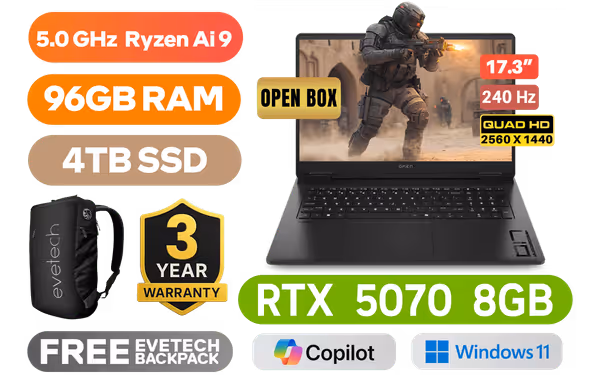 [OPEN BOX] HP OMEN Gaming Laptop 17-db1005ni AMD Ryzen AI 9 365 up to 5.0GHz Processor, 34MB Cache, 10x Cores, 20x Threads / 96GB DDR5 RAM / 4TB Ultra-Fast NVME SSD / 17.3" QHD (2560 x 1440) 240Hz, Anti-glare Display / NVIDIA GeForce RTX 5070 8GB GDDR7 Dedicated Graphics / HP 1080p FHD IR Camera With Privacy Shutter / Windows 11 Home (64bit) / RealTek 8852BE-VT Wi-Fi 6 Wireless LAN / Bluetooth 5.4 / 3x USB Type-A / 1x USB Type-C with DisplayPort™ / 1x HDMI 2.1 / RJ-45 Ethernet Port / 1x Headphone and Microphone Combo Jack / 1-Zone RGB Backlit Keyboard / Dual Integrated speakers With HyperX Audio / HP OMEN Gaming Laptop 17-db1005ni AMD Ryzen AI 9 365 RTX 5070 Gaming Laptop Deal[OPEN BOX] HP OMEN Gaming Laptop 17-db1005ni AMD Ryzen AI 9 365 up to 5.0GHz Processor, 34MB Cache, 10x Cores, 20x Threads / 96GB DDR5 RAM / 4TB Ultra-Fast NVME SSD / 17.3" QHD (2560 x 1440) 240Hz, Anti-glare Display / NVIDIA GeForce RTX 5070 8GB GDDR7 Dedicated Graphics / HP 1080p FHD IR Camera With Privacy Shutter / Windows 11 Home (64bit) / RealTek 8852BE-VT Wi-Fi 6 Wireless LAN / Bluetooth 5.4 / 3x USB Type-A / 1x USB Type-C with DisplayPort™ / 1x HDMI 2.1 / RJ-45 Ethernet Port / 1x Headphone and Microphone Combo Jack / 1-Zone RGB Backlit Keyboard / Dual Integrated speakers With HyperX Audio / HP OMEN Gaming Laptop 17-db1005ni AMD Ryzen AI 9 365 RTX 5070 Gaming Laptop Deal [BQ7W9EA/96GB/4TB] / [+] GET FREE EVETECH NEO Premium Gaming Backpack / 3 YEARS WARRANTY / [+]Get Resident Evil: Requiem with select GeForce RTX 50 Series (Standard Edition)+ FREE DELIVERY !