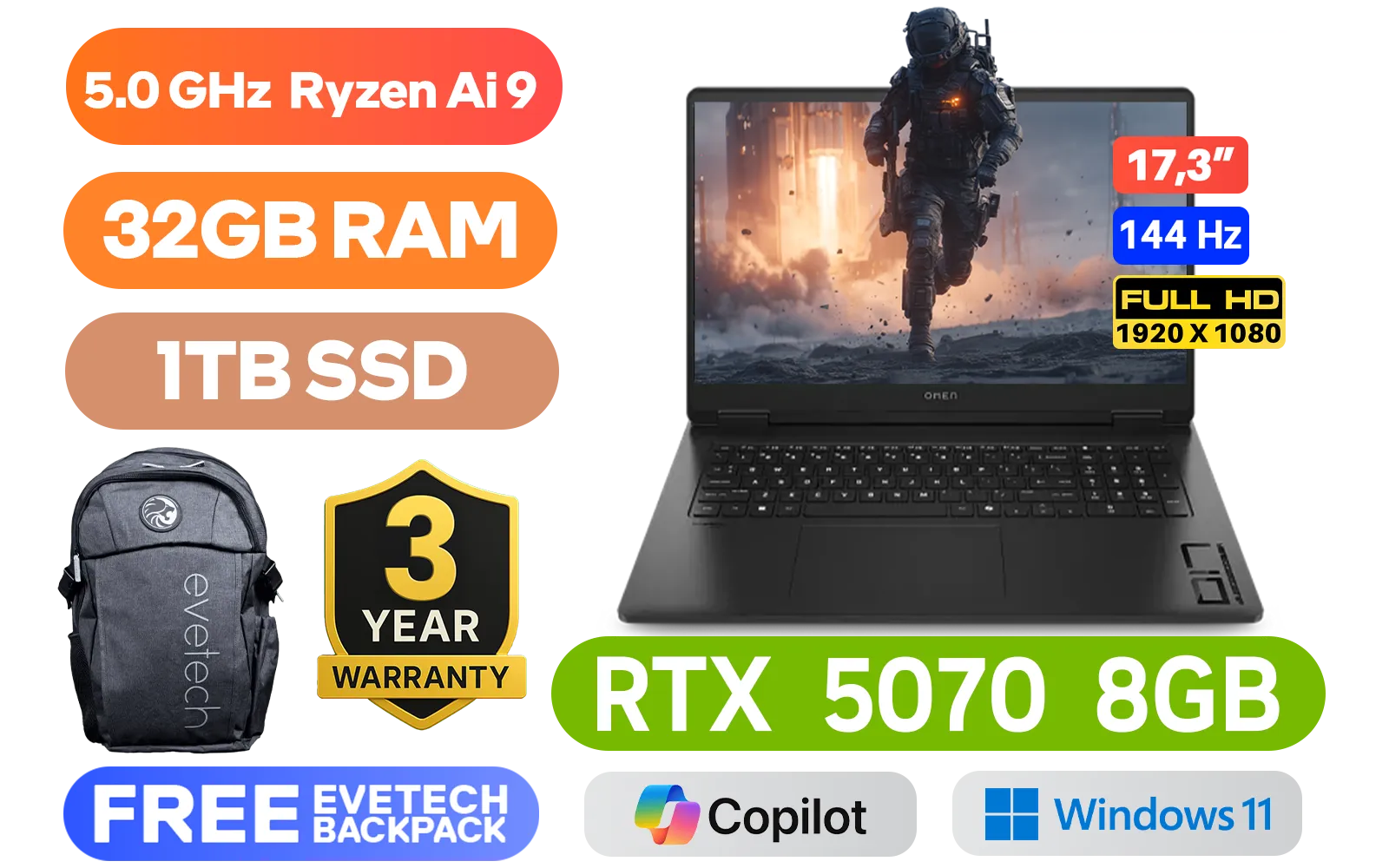 HP OMEN Gaming Laptop 17-db1007ni AMD Ryzen AI 9 365 up to 5.0GHz Processor, 34MB Cache, 10x Cores, 20x Threads / 32GB DDR5 RAM / 1TB Ultra-Fast NVME SSD / 17.3" FHD (1920 x 1080) Anti-glare 144Hz With IPS-Level Display / NVIDIA GeForce RTX 5070 8GB GDDR7 Dedicated Graphics / Windows 11 Home (64bit) / HP 1080p FHD IR Camera / RealTek 8852BE-VT Wi-Fi 6 Wireless LAN / Bluetooth 5.4 / 3x USB Type-A / 1x USB Type-C with Power Delivery 3.1, DisplayPortâĸ 2.1, HP Sleep and Charge / 1x HDMI 2.1 / 1x Headphone and Microphone Combo Jack / 1x RJ45 Port / 1-Zone RGB Backlit Keyboard / Audio by HyperX and DTS:XÂŽ Ultra / HP OMEN Gaming Laptop 17-db1007ni AMD Ryzen AI 9 365 RTX 5070 Gaming Laptop DealHP OMEN Gaming Laptop 17-db1007ni AMD Ryzen AI 9 365 up to 5.0GHz Processor, 34MB Cache, 10x Cores, 20x Threads / 32GB DDR5 RAM / 1TB Ultra-Fast NVME SSD / 17.3" FHD (1920 x 1080) Anti-glare 144Hz With IPS-Level Display / NVIDIA GeForce RTX 5070 8GB GDDR7 Dedicated Graphics / Windows 11 Home (64bit) / HP 1080p FHD IR Camera / RealTek 8852BE-VT Wi-Fi 6 Wireless LAN / Bluetooth 5.4 / 3x USB Type-A / 1x USB Type-C with Power Delivery 3.1, DisplayPortâĸ 2.1, HP Sleep and Charge / 1x HDMI 2.1 / 1x Headphone and Microphone Combo Jack / 1x RJ45 Port / 1-Zone RGB Backlit Keyboard / Audio by HyperX and DTS:XÂŽ Ultra / HP OMEN Gaming Laptop 17-db1007ni AMD Ryzen AI 9 365 RTX 5070 Gaming Laptop Deal [BQ7Y0EA] / 3 YEARS WARRANTY / [+] GET FREE EVETECH FLUX Premium Gaming Backpack / [+]Get Resident Evil Requiem with select GeForce RTX 50 Series (Standard Edition)+ FREE DELIVERY !