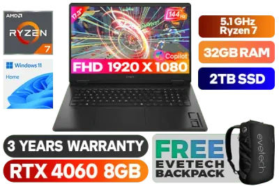 OMEN by HP Laptop 17-db0001ni AMD Ryzen™ 7 8845HS up to 5.1 GHz Processor, 16MB Cache, 8x Cores, 16x Threads / 32GB DDR5 RAM / 2TB Ultra-Fast NVME SSD / 17.3" FHD 1920x1080 144Hz Anti-glare IPS-Level Display / NVIDIA GeForce RTX 4060 8GB GDDR6 Dedicated Graphics / Windows 11 Home 64bit / MediaTek Wi-Fi 6E MT7922 Wireless LAN / Bluetooth 5.3 / HP True Vision 1080p FHD Camera / 3x USB Type-A / 1x USB Type-C (USB Power Delivery, DisplayPort™ 1.4a, HP Sleep and Charge) / 1x HDMI 2.1 / 1x Headphone and Microphone Combo Jack / 1x RJ45 Ethernet LAN / RGB Backlit Keyboard / DTS:X® Ultra HyperX Dual speakers; HP Audio Boost / HP OMEN 17 Ryzen 7 RTX 4060 Gaming Laptop DealOMEN by HP Laptop 17-db0001ni AMD Ryzen™ 7 8845HS up to 5.1 GHz Processor, 16MB Cache, 8x Cores, 16x Threads / 32GB DDR5 RAM / 2TB Ultra-Fast NVME SSD / 17.3" FHD 1920x1080 144Hz Anti-glare IPS-Level Display / NVIDIA GeForce RTX 4060 8GB GDDR6 Dedicated Graphics / Windows 11 Home 64bit / MediaTek Wi-Fi 6E MT7922 Wireless LAN / Bluetooth 5.3 / HP True Vision 1080p FHD Camera / 3x USB Type-A / 1x USB Type-C (USB Power Delivery, DisplayPort™ 1.4a, HP Sleep and Charge) / 1x HDMI 2.1 / 1x Headphone and Microphone Combo Jack / 1x RJ45 Ethernet LAN / RGB Backlit Keyboard / DTS:X® Ultra HyperX Dual speakers; HP Audio Boost / HP OMEN 17 Ryzen 7 RTX 4060 Gaming Laptop Deal [A76RVEA/32GB/2TB] / 3 YEARS WARRANTY / [+] GET FREE EVETECH NEO Premium Gaming Backpack+ FREE DELIVERY !
