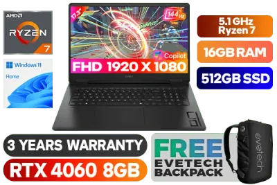 OMEN by HP Laptop 17-db0001ni AMD Ryzen™ 7 8845HS up to 5.1 GHz Processor, 16MB Cache, 8x Cores, 16x Threads / 16GB DDR5 RAM / 512GB Ultra-Fast NVME SSD / 17.3" FHD 1920x1080 144Hz Anti-glare IPS-Level Display / NVIDIA GeForce RTX 4060 8GB GDDR6 Dedicated Graphics / Windows 11 Home 64bit / MediaTek Wi-Fi 6E MT7922 Wireless LAN / Bluetooth 5.3 / HP True Vision 1080p FHD Camera / 3x USB Type-A / 1x USB Type-C (USB Power Delivery, DisplayPort™ 1.4a, HP Sleep and Charge) / 1x HDMI 2.1 / 1x Headphone and Microphone Combo Jack / 1x RJ45 Ethernet LAN / RGB Backlit Keyboard / DTS:X® Ultra HyperX Dual speakers; HP Audio Boost / HP OMEN 17 Ryzen 7 RTX 4060 Gaming Laptop DealOMEN by HP Laptop 17-db0001ni AMD Ryzen™ 7 8845HS up to 5.1 GHz Processor, 16MB Cache, 8x Cores, 16x Threads / 16GB DDR5 RAM / 512GB Ultra-Fast NVME SSD / 17.3" FHD 1920x1080 144Hz Anti-glare IPS-Level Display / NVIDIA GeForce RTX 4060 8GB GDDR6 Dedicated Graphics / Windows 11 Home 64bit / MediaTek Wi-Fi 6E MT7922 Wireless LAN / Bluetooth 5.3 / HP True Vision 1080p FHD Camera / 3x USB Type-A / 1x USB Type-C (USB Power Delivery, DisplayPort™ 1.4a, HP Sleep and Charge) / 1x HDMI 2.1 / 1x Headphone and Microphone Combo Jack / 1x RJ45 Ethernet LAN / RGB Backlit Keyboard / DTS:X® Ultra HyperX Dual speakers; HP Audio Boost / HP OMEN 17 Ryzen 7 RTX 4060 Gaming Laptop Deal [A76RVEA] / 3 YEARS WARRANTY / [+] GET FREE EVETECH NEO Premium Gaming Backpack+ FREE DELIVERY !