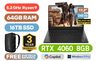 OMEN by HP Laptop 17-db0000ni AMD Ryzen 9 8945HS up to 5.2GHz Processor with AMD Max Boost Clock Technology, 16MB Cache, 8x Cores, 16x Threads / 64GB DDR5 RAM / 16TB Ultra-Fast NVME SSD / 17.3" QHD 2560x1440 Anti-glare 240Hz Refresh Rate With IPS-Level micro-edge Display / NVIDIA 40 Series GeForce RTX 4060 8GB GDDR6 Dedicated Graphics / <span style="font-size: 20px; color: #00BFFF; font-weight: bold;">Windows 11 Professional (64bit)</span> / Realtek Wi-Fi 6 802.11ax Wireless LAN / Bluetooth 5.3 / HP True Vision 1080p FHD camera with temporal noise reduction and integrated dual array digital microphones / 3x USB Type-A / 1x USB Type-C / 1x RJ-45 / 1x HDMI 2.1 / 1x Headphone and Microphone Combo Jack / RGB Backlit Keyboard / Audio by HyperX; DTS:X® Ultra; Dual speakers; HP Audio Boost / HP OMEN 17 Ryzen 9 RTX 4060 Gaming Laptop DealOMEN by HP Laptop 17-db0000ni AMD Ryzen 9 8945HS up to 5.2GHz Processor with AMD Max Boost Clock Technology, 16MB Cache, 8x Cores, 16x Threads / 64GB DDR5 RAM / 16TB Ultra-Fast NVME SSD / 17.3" QHD 2560x1440 Anti-glare 240Hz Refresh Rate With IPS-Level micro-edge Display / NVIDIA 40 Series GeForce RTX 4060 8GB GDDR6 Dedicated Graphics / Windows 11 Professional (64bit) / Realtek Wi-Fi 6 802.11ax Wireless LAN / Bluetooth 5.3 / HP True Vision 1080p FHD camera with temporal noise reduction and integrated dual array digital microphones / 3x USB Type-A / 1x USB Type-C / 1x RJ-45 / 1x HDMI 2.1 / 1x Headphone and Microphone Combo Jack / RGB Backlit Keyboard / Audio by HyperX; DTS:X® Ultra; Dual speakers; HP Audio Boost / HP OMEN 17 Ryzen 9 RTX 4060 Gaming Laptop Deal [A76U4EA/64GB/16TB] / 3 YEARS WARRANTY / [+] GET FREE EVETECH NEO Premium Gaming Backpack+ FREE DELIVERY !
