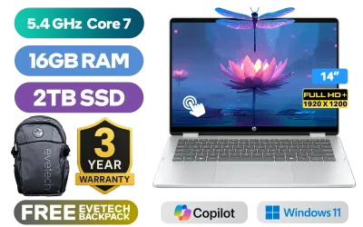 [TOUCHSCREEN] HP OmniBook 5 Ultra Flip 14-fp0005ni 2-in-1 Laptop Intel Core 7-150U up to 5.4GHz Processor, 12MB Cache, 10x Cores, 12x Threads / 16GB LPDDR5 RAM / 2TB Ultra-Fast NVMe SSD / 14" FHD+ (1920 x 1200) IPS-Level Touchscreen Display / Integrated Intel Graphics / Windows 11 Home(64bit) / Realtek RTL8852BE-VT WiFi 6 Wireless LAN / Bluetooth 5.4 / 1080p FHD camera / 2x USB Type-A / 2x USB Type-C (Supports Power Delivery 3.1 / DisplayPort 1.4) / 1x Headphone and Microphone Combo Jack / Dual Speakers with HP Audio Boost / HP OmniBook 5 Ultra Flip 14-fp0005ni 2-in-1 Intel Core 7 Laptop Deal[TOUCHSCREEN] HP OmniBook 5 Ultra Flip 14-fp0005ni 2-in-1 Laptop Intel Core 7-150U up to 5.4GHz Processor, 12MB Cache, 10x Cores, 12x Threads / 16GB LPDDR5 RAM / 2TB Ultra-Fast NVMe SSD / 14" FHD+ (1920 x 1200) IPS-Level Touchscreen Display / Integrated Intel Graphics / Windows 11 Home(64bit) / Realtek RTL8852BE-VT WiFi 6 Wireless LAN / Bluetooth 5.4 / 1080p FHD camera / 2x USB Type-A / 2x USB Type-C (Supports Power Delivery 3.1 / DisplayPort 1.4) / 1x Headphone and Microphone Combo Jack / Dual Speakers with HP Audio Boost / HP OmniBook 5 Ultra Flip 14-fp0005ni 2-in-1 Intel Core 7 Laptop Deal [C81SMEA/2TB] / [+] GET FREE EVETECH FLUX Premium Gaming Backpack / 3 YEARS WARRANTY + FREE DELIVERY !