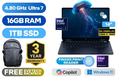 [TOUCHSCREEN] HP OmniBook Ultra Flip 2-in-1 Laptop 14-fh0002ni Intel® Core⢠Ultra 7-256V up to 4.80GHz Processor, 12MB Cache, 8x Cores, 8x Threads / 16GB LPDDR5X RAM / 1TB Ultra-Fast NVMe SSD / 14" 3K (2880 x 1800) OLED Display / Integrated Intel® Arc Graphics / Windows 11 Home(64bit) / Intel Wi-Fi 7 BE201 Wireless LAN / Bluetooth 5.4 / HP Wide Vision 9MP IR camera with Privacy shutter / 1x Headphone and Microphone Combo Jack / 3x USB Type-C / Fingerprint Reader / White Backlit Keyboard / Audio by DTS:X® Ultra HP Audio Boost / FREE HP Tilt Pen / HP OmniBook Ultra Flip 2-in-1 Intel® Core⢠Ultra 7 Touchscreen Laptop Deal[TOUCHSCREEN] HP OmniBook Ultra Flip 2-in-1 Laptop 14-fh0002ni Intel® Core⢠Ultra 7-256V up to 4.80GHz Processor, 12MB Cache, 8x Cores, 8x Threads / 16GB LPDDR5X RAM / 1TB Ultra-Fast NVMe SSD / 14" 3K (2880 x 1800) OLED Display / Integrated Intel® Arc Graphics / Windows 11 Home(64bit) / Intel Wi-Fi 7 BE201 Wireless LAN / Bluetooth 5.4 / HP Wide Vision 9MP IR camera with Privacy shutter / 1x Headphone and Microphone Combo Jack / 3x USB Type-C / Fingerprint Reader / White Backlit Keyboard / Audio by DTS:X® Ultra HP Audio Boost / FREE HP Tilt Pen / HP OmniBook Ultra Flip 2-in-1 Intel® Core⢠Ultra 7 Touchscreen Laptop Deal [AU3F4EA] / 3 YEARS WARRANTY / [+] GET FREE EVETECH FLUX Premium Gaming Backpack+ FREE DELIVERY !