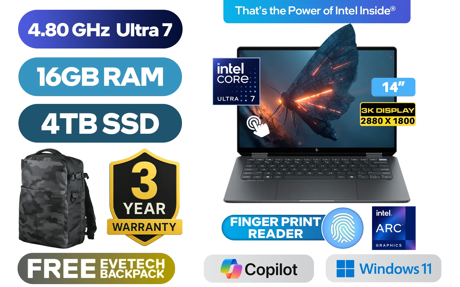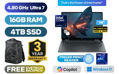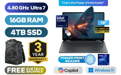 [TOUCHSCREEN] HP OmniBook Ultra Flip 2-in-1 Laptop 14-fh0004ni Intel® Core™ Ultra 7-256V up to 4.80GHz Processor, 12MB Cache, 8x Cores, 8x Threads / 16GB LPDDR5X RAM / 4TB Ultra-Fast NVMe SSD / 14" 3K (2880 x 1800) OLED Touchscreen Display / Integrated Intel® Arc Graphics / Windows 11 Home(64bit) / Intel Wi-Fi 7 BE201 Wireless LAN / Bluetooth 5.4 / HP Wide Vision 9MP IR camera with Privacy shutter / 1x Headphone and Microphone Combo Jack / 3x USB Type-C / Fingerprint Reader / White Backlit Keyboard / Audio by DTS:X® Ultra HP Audio Boost / FREE HP Tilt Pen / HP OmniBook Ultra Flip 2-in-1 Intel® Core™ Ultra 7 Touchscreen Laptop Deal[TOUCHSCREEN] HP OmniBook Ultra Flip 2-in-1 Laptop 14-fh0004ni Intel® Core™ Ultra 7-256V up to 4.80GHz Processor, 12MB Cache, 8x Cores, 8x Threads / 16GB LPDDR5X RAM / 4TB Ultra-Fast NVMe SSD / 14" 3K (2880 x 1800) OLED Touchscreen Display / Integrated Intel® Arc Graphics / Windows 11 Home(64bit) / Intel Wi-Fi 7 BE201 Wireless LAN / Bluetooth 5.4 / HP Wide Vision 9MP IR camera with Privacy shutter / 1x Headphone and Microphone Combo Jack / 3x USB Type-C / Fingerprint Reader / White Backlit Keyboard / Audio by DTS:X® Ultra HP Audio Boost / FREE HP Tilt Pen / HP OmniBook Ultra Flip 2-in-1 Intel® Core™ Ultra 7 Touchscreen Laptop Deal [AU3F6EA/4TB] / 3 YEARS WARRANTY / [+] GET FREE EVETECH DASH Premium Gaming Backpack+ FREE DELIVERY !