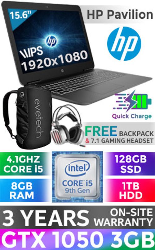 HP Pavilion 15-bc505ni 9th Gen Intel Core i5-9300H up to 4.10GHz Processor with Intel Turbo Boost Technology, 8MB Cache, 4x Cores, 8x Threads / 8GB DDR4 RAM / 128GB Ultra-Fast SSD + 1TB Hard Drive / 15.6" FHD 1920x1080 Anti-Glare IPS Micro-edge Slim-Bezel Display / NVIDIA GeForce GTX 1050 3GB GDDR5 DX12 Dedicated Graphics With Desktop Level Performance / Dual Band 802.11ac Wireless LAN / Bluetooth 4.2 / HP Wide Vision 720p Camera with Integrated Dual Array Digital Microphone / Windows 10 Home 64bit / 2x USB 3.1 Type-A / 1x USB 2.0 Type-A / 1x HDMI / 1x Audio In And Out Combo Jack / Integrated GbE LAN / 1x Multi-format SD Card Reader / No DVD Drive Included / Full-Size Island Style Keyboard / Bang & Olufsen, Dual speakers, HP Audio Boost / Ultra-light Weight 2.2kg Gaming Laptop / Up to 10 Hours Battery Life / <span style="font-size:18px; color:red;">3 YEAR ON-SITE WARRANTY</span> / Supports battery fast charge: approximately 50% in 45 minutes / HP Pavilion 15 Core i5 GTX 1050 Gaming Laptop DealHP Pavilion 15-bc505ni 9th Gen Intel Core i5-9300H up to 4.10GHz Processor with Intel Turbo Boost Technology, 8MB Cache, 4x Cores, 8x Threads / 8GB DDR4 RAM / 128GB Ultra-Fast SSD + 1TB Hard Drive / 15.6" FHD 1920x1080 Anti-Glare IPS Micro-edge Slim-Bezel Display / NVIDIA GeForce GTX 1050 3GB GDDR5 DX12 Dedicated Graphics With Desktop Level Performance / Dual Band 802.11ac Wireless LAN / Bluetooth 4.2 / HP Wide Vision 720p Camera with Integrated Dual Array Digital Microphone / Windows 10 Home 64bit / 2x USB 3.1 Type-A / 1x USB 2.0 Type-A / 1x HDMI / 1x Audio In And Out Combo Jack / Integrated GbE LAN / 1x Multi-format SD Card Reader / No DVD Drive Included / Full-Size Island Style Keyboard / Bang & Olufsen, Dual speakers, HP Audio Boost / Ultra-light Weight 2.2kg Gaming Laptop / Up to 10 Hours Battery Life / 3 YEAR ON-SITE WARRANTY / Supports battery fast charge: approximately 50% in 45 minutes / HP Pavilion 15 Core i5 GTX 1050 Gaming Laptop Deal [7DM21EA/128GB] / [+] GET FREE EVETECH NEO Premium Gaming Backpack+ FREE DELIVERY !