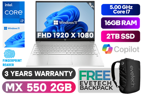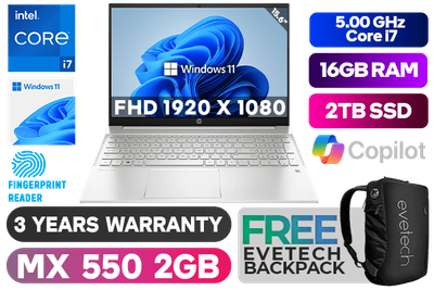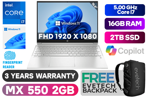 HP Pavilion 15-eg3000ni 7Z8S7EA 13th Gen Intel® Core™ i7-1355U up to 5.00GHz Processor, 12MB Cache, 10x Cores, 12x Threads / 16GB DDR4 RAM / 2TB Ultra-Fast NVMe SSD / 15.6" FHD 1920x1080 Anti-glare IPS-level Micro-edge Display / NVIDIA Geforce MX550 2GB GDDR6 DirectX 12 Dedicated Graphics Card / Windows 11 Home (64bit) / Fingerprint Reader / Realtek WiFi 6 Wireless LAN / Bluetooth 5.2 / HP Wide Vision 720p HD Camera with Integrated Dual Array Digital Microphones / 2x SuperSpeed USB Type-A / 1x USB Type-C / 1x HDMI / 1x Headphone and Microphone Audio Combo Jack / No DVD Drive Included / White Backlit Keyboard / HP Pavilion 15-eg3000ni 13th Gen Intel® Core™ i7 laptop DealHP Pavilion 15-eg3000ni 7Z8S7EA 13th Gen Intel® Core™ i7-1355U up to 5.00GHz Processor, 12MB Cache, 10x Cores, 12x Threads / 16GB DDR4 RAM / 2TB Ultra-Fast NVMe SSD / 15.6" FHD 1920x1080 Anti-glare IPS-level Micro-edge Display / NVIDIA Geforce MX550 2GB GDDR6 DirectX 12 Dedicated Graphics Card / Windows 11 Home (64bit) / Fingerprint Reader / Realtek WiFi 6 Wireless LAN / Bluetooth 5.2 / HP Wide Vision 720p HD Camera with Integrated Dual Array Digital Microphones / 2x SuperSpeed USB Type-A / 1x USB Type-C / 1x HDMI / 1x Headphone and Microphone Audio Combo Jack / No DVD Drive Included / White Backlit Keyboard / HP Pavilion 15-eg3000ni 13th Gen Intel® Core™ i7 laptop Deal [7Z8S7EA/2TB] / 3 YEARS WARRANTY / [+] GET FREE EVETECH NEO Premium Gaming Backpack+ FREE DELIVERY !