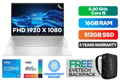 HP Pavilion 15-eg3002ni 7Z8S9EA 13th Gen Intel® Core™ i5-1335U up to 4.60GHz Processor, 12MB Cache, 10x Cores, 12x Threads / 16GB DDR4 RAM / 512GB Ultra-Fast NVMe SSD / 15.6" FHD 1920x1080 Anti-glare IPS-level Micro-edge Display / Integrated Intel® Iris® Xe Graphics DirectX 12 Graphics / Windows 11 Home (64bit) / Fingerprint Reader / Realtek WiFi 6 Wireless LAN / Bluetooth 5.2 / HP Wide Vision 720p HD Camera with Integrated Dual Array Digital Microphones / 2x SuperSpeed USB Type-A / 1x USB Type-C / 1x HDMI / 1x Headphone and Microphone Audio Combo Jack / No DVD Drive Included / White Backlit Keyboard / HP Pavilion 15-eg3002ni 13th Gen Intel® Core™ i5 laptop DealHP Pavilion 15-eg3002ni 7Z8S9EA 13th Gen Intel® Core™ i5-1335U up to 4.60GHz Processor, 12MB Cache, 10x Cores, 12x Threads / 16GB DDR4 RAM / 512GB Ultra-Fast NVMe SSD / 15.6" FHD 1920x1080 Anti-glare IPS-level Micro-edge Display / Integrated Intel® Iris® Xe Graphics DirectX 12 Graphics / Windows 11 Home (64bit) / Fingerprint Reader / Realtek WiFi 6 Wireless LAN / Bluetooth 5.2 / HP Wide Vision 720p HD Camera with Integrated Dual Array Digital Microphones / 2x SuperSpeed USB Type-A / 1x USB Type-C / 1x HDMI / 1x Headphone and Microphone Audio Combo Jack / No DVD Drive Included / White Backlit Keyboard / HP Pavilion 15-eg3002ni 13th Gen Intel® Core™ i5 laptop Deal [7Z8S9EA] / 3 YEARS WARRANTY / [+] GET FREE EVETECH NEO Premium Gaming Backpack+ FREE DELIVERY !