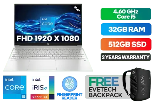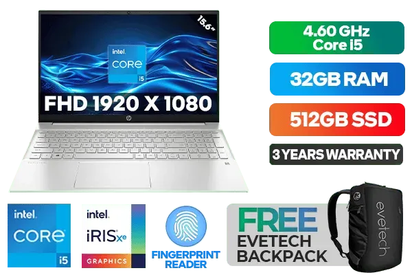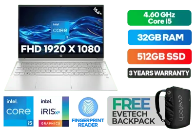 HP Pavilion 15-eg3002ni 7Z8S9EA 13th Gen Intel® Core™ i5-1335U up to 4.60GHz Processor, 12MB Cache, 10x Cores, 12x Threads / 32GB DDR4 RAM / 512GB Ultra-Fast NVMe SSD / 15.6" FHD 1920x1080 Anti-glare IPS-level Micro-edge Display / Integrated Intel® Iris® Xe Graphics DirectX 12 Graphics / Windows 11 Home (64bit) / Fingerprint Reader / Realtek WiFi 6 Wireless LAN / Bluetooth 5.2 / HP Wide Vision 720p HD Camera with Integrated Dual Array Digital Microphones / 2x SuperSpeed USB Type-A / 1x USB Type-C / 1x HDMI / 1x Headphone and Microphone Audio Combo Jack / No DVD Drive Included / White Backlit Keyboard / HP Pavilion 15-eg3002ni 13th Gen Intel® Core™ i5 laptop DealHP Pavilion 15-eg3002ni 7Z8S9EA 13th Gen Intel® Core™ i5-1335U up to 4.60GHz Processor, 12MB Cache, 10x Cores, 12x Threads / 32GB DDR4 RAM / 512GB Ultra-Fast NVMe SSD / 15.6" FHD 1920x1080 Anti-glare IPS-level Micro-edge Display / Integrated Intel® Iris® Xe Graphics DirectX 12 Graphics / Windows 11 Home (64bit) / Fingerprint Reader / Realtek WiFi 6 Wireless LAN / Bluetooth 5.2 / HP Wide Vision 720p HD Camera with Integrated Dual Array Digital Microphones / 2x SuperSpeed USB Type-A / 1x USB Type-C / 1x HDMI / 1x Headphone and Microphone Audio Combo Jack / No DVD Drive Included / White Backlit Keyboard / HP Pavilion 15-eg3002ni 13th Gen Intel® Core™ i5 laptop Deal [7Z8S9EA/32GB] / 3 YEARS WARRANTY / [+] GET FREE EVETECH NEO Premium Gaming Backpack+ FREE DELIVERY !