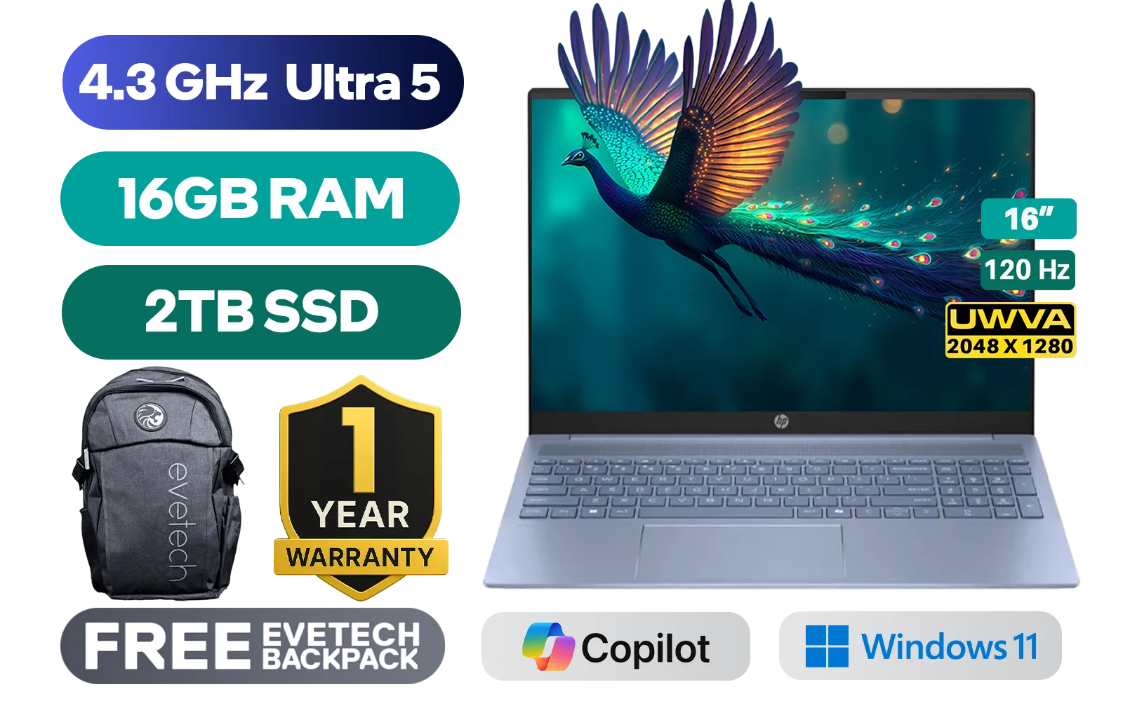 HP Pavilion 16-af0013ni Intelยฎ Coreโข Ultra 5-125U up to 4.3GHz Processor, 12MB Cache, 12x Cores, 14x Threads / 16GB LPDDR5x RAM / 2TB Ultra-Fast NVMe SSD / 16" UWVA (2048x1280) 120Hz OLED Display / Integrated Intelยฎ Graphics / Windows 11 Home (64bit) / Intel WiFi 6E AX211 Wireless LAN / Bluetooth 5.3 / 1080p FHD IR Camera / 2x USB Type-A / 2x USB Type-C (Supports DisplayPort 1.4 / Power Delivery) / 1x HDMI / 1x Headphone and Microphone Combo Jack / White Backlit Keyboard / Dual Stereo Speakers / 1 Year Warranty / HP Pavilion 16-af0013ni Intel Core Ultra 5 Laptop DealHP Pavilion 16-af0013ni Intelยฎ Coreโข Ultra 5-125U up to 4.3GHz Processor, 12MB Cache, 12x Cores, 14x Threads / 16GB LPDDR5x RAM / 2TB Ultra-Fast NVMe SSD / 16" UWVA (2048x1280) 120Hz OLED Display / Integrated Intelยฎ Graphics / Windows 11 Home (64bit) / Intel WiFi 6E AX211 Wireless LAN / Bluetooth 5.3 / 1080p FHD IR Camera / 2x USB Type-A / 2x USB Type-C (Supports DisplayPort 1.4 / Power Delivery) / 1x HDMI / 1x Headphone and Microphone Combo Jack / White Backlit Keyboard / Dual Stereo Speakers / 1 Year Warranty / HP Pavilion 16-af0013ni Intel Core Ultra 5 Laptop Deal [B22Y2EA-1yr/2TB] / [+] GET FREE EVETECH FLUX Premium Gaming Backpack+ FREE DELIVERY !