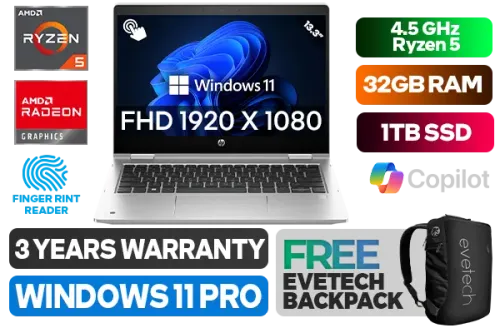 [TOUCHSCREEN] HP ProBook X360 435 G10 AMD Ryzen 5 7530U up to 4.5GHz Processor with AMD Max Boost Clock Technology, 19MB Cache, 6x Cores, 12x Threads / 32GB DDR4 RAM / 1TB Ultra-Fast NVME SSD / 13.3" FHD 1920 x 1080 IPS Display With Touch Screen / Integrated AMD Radeon™ Graphics / <span style="font-size: 20px; color: #00BFFF; font-weight: bold;">Windows 11 Professional (64bit)</span> / MediaTek Wi-Fi 6E RZ616 Wireless LAN / Bluetooth 5.3 / 5 MP Web Camera / 2x USB Type-A / 1x USB Type-C / 1x HDMI / 1x Audio and Microphone Combo Jack / Micro SD Card Reader / Finger Print Reader / Spill Resistant Keyboard / HP Pro X360 435 G10 Ryzen 5 Laptop Laptop Deal[TOUCHSCREEN] HP ProBook X360 435 G10 AMD Ryzen 5 7530U up to 4.5GHz Processor with AMD Max Boost Clock Technology, 19MB Cache, 6x Cores, 12x Threads / 32GB DDR4 RAM / 1TB Ultra-Fast NVME SSD / 13.3" FHD 1920 x 1080 IPS Display With Touch Screen / Integrated AMD Radeon™ Graphics / Windows 11 Professional (64bit) / MediaTek Wi-Fi 6E RZ616 Wireless LAN / Bluetooth 5.3 / 5 MP Web Camera / 2x USB Type-A / 1x USB Type-C / 1x HDMI / 1x Audio and Microphone Combo Jack / Micro SD Card Reader / Finger Print Reader / Spill Resistant Keyboard / HP Pro X360 435 G10 Ryzen 5 Laptop Laptop Deal [9G2J5ET/32GB/1TB] / 3 YEARS WARRANTY / [+] GET FREE EVETECH NEO Premium Gaming Backpack+ FREE DELIVERY !