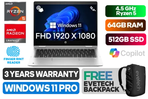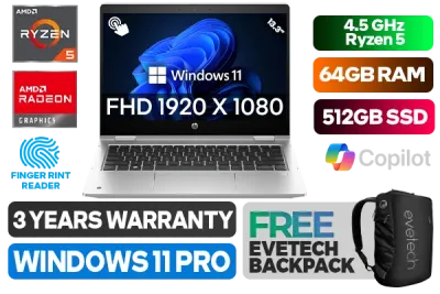 [TOUCHSCREEN] HP ProBook X360 435 G10 AMD Ryzen 5 7530U up to 4.5GHz Processor with AMD Max Boost Clock Technology, 19MB Cache, 6x Cores, 12x Threads / 64GB DDR4 RAM / 512GB Ultra-Fast NVME SSD / 13.3" FHD 1920 x 1080 IPS Display With Touch Screen / Integrated AMD Radeon™ Graphics / <span style="font-size: 20px; color: #00BFFF; font-weight: bold;">Windows 11 Professional (64bit)</span> / MediaTek Wi-Fi 6E RZ616 Wireless LAN / Bluetooth 5.3 / 5 MP Web Camera / 2x USB Type-A / 1x USB Type-C / 1x HDMI / 1x Audio and Microphone Combo Jack / Micro SD Card Reader / Finger Print Reader / Spill Resistant Keyboard / HP Pro X360 435 G10 Ryzen 5 Laptop Laptop Deal[TOUCHSCREEN] HP ProBook X360 435 G10 AMD Ryzen 5 7530U up to 4.5GHz Processor with AMD Max Boost Clock Technology, 19MB Cache, 6x Cores, 12x Threads / 64GB DDR4 RAM / 512GB Ultra-Fast NVME SSD / 13.3" FHD 1920 x 1080 IPS Display With Touch Screen / Integrated AMD Radeon™ Graphics / Windows 11 Professional (64bit) / MediaTek Wi-Fi 6E RZ616 Wireless LAN / Bluetooth 5.3 / 5 MP Web Camera / 2x USB Type-A / 1x USB Type-C / 1x HDMI / 1x Audio and Microphone Combo Jack / Micro SD Card Reader / Finger Print Reader / Spill Resistant Keyboard / HP Pro X360 435 G10 Ryzen 5 Laptop Laptop Deal [9G2J5ET/64GB] / 3 YEARS WARRANTY / [+] GET FREE EVETECH NEO Premium Gaming Backpack+ FREE DELIVERY !