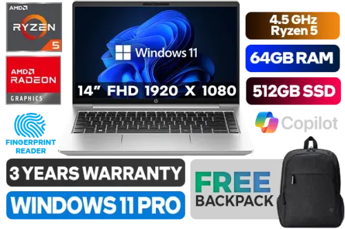 HP ProBook 445 G10 AMD Ryzen 5 7530U up to 4.5GHz Processor, 19MB Cache, 6x Cores, 12x Threads / 64GB DDR4 RAM / 512GB Ultra Fast NVMe SSD / 14" FHD (1920 x 1080) Anti-Glare Display / Integrated Radeon Graphics / <span style="font-size: 20px; color: #00BFFF; font-weight: bold;">Windows 11 Professional (64bit)</span> / MediaTek WiFi 6E Wireless LAN / Bluetooth 5.3 / 720p HD Web camera / 3x USB Type-A / 1x USB Type-C / 1x HDMI / 1x Headphone And Microphone Combo Jack / 1x RJ45 / 1x SIM Slot / Fingerprint Reader / White Backlit Spill Resistant Keyboard / FREE HP Wireless Mouse / Free HP Backpack / HP ProBook 445 G10 Ryzen 5 Laptop DealHP ProBook 445 G10 AMD Ryzen 5 7530U up to 4.5GHz Processor, 19MB Cache, 6x Cores, 12x Threads / 64GB DDR4 RAM / 512GB Ultra Fast NVMe SSD / 14" FHD (1920 x 1080) Anti-Glare Display / Integrated Radeon Graphics / Windows 11 Professional (64bit) / MediaTek WiFi 6E Wireless LAN / Bluetooth 5.3 / 720p HD Web camera / 3x USB Type-A / 1x USB Type-C / 1x HDMI / 1x Headphone And Microphone Combo Jack / 1x RJ45 / 1x SIM Slot / Fingerprint Reader / White Backlit Spill Resistant Keyboard / FREE HP Wireless Mouse / Free HP Backpack / HP ProBook 445 G10 Ryzen 5 Laptop Deal [70Z73AV/64GB] / 3 YEARS WARRANTY + FREE DELIVERY !