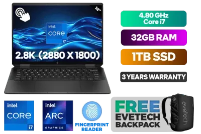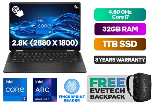 [TOUCHSCREEN] HP Spectre x360 2-in-1 Laptop 14-eu0004ni Intel® Core™ Ultra 7-155H up to 4.80GHz Processor, 24MB Cache, 16x Cores, 22x Threads / 32GB LPDDR5X RAM / 1TB Ultra-Fast NVMe SSD / 14" 2.8K (2880 x 1800) OLED, 120Hz, Micro-edge IPS Touchscreen Display / Integrated Intel Arc Graphics / Windows 11 Home (64bit) / Dual Band Wi-Fi 7 BE200 Wireless LAN / Bluetooth 5.4 / HP Wide Vision 9MP IR camera with camera shutter / 1x USB Type-A / 2x USB Type-C (USB Power Delivery, DisplayPort™ 2.1, HP Sleep and Charge) / FINGERPRINT READER / 1x Headphone and Microphone Combo Jack / White Backlit Keyboard / Audio by DTS:X® Ultra HP Audio Boost / FREE HP Tilt Pen / HP Spectre x360 2-in-1 Intel® Core™ Ultra 7 Touchscreen Laptop Deal[TOUCHSCREEN] HP Spectre x360 2-in-1 Laptop 14-eu0004ni Intel® Core™ Ultra 7-155H up to 4.80GHz Processor, 24MB Cache, 16x Cores, 22x Threads / 32GB LPDDR5X RAM / 1TB Ultra-Fast NVMe SSD / 14" 2.8K (2880 x 1800) OLED, 120Hz, Micro-edge IPS Touchscreen Display / Integrated Intel Arc Graphics / Windows 11 Home (64bit) / Dual Band Wi-Fi 7 BE200 Wireless LAN / Bluetooth 5.4 / HP Wide Vision 9MP IR camera with camera shutter / 1x USB Type-A / 2x USB Type-C (USB Power Delivery, DisplayPort™ 2.1, HP Sleep and Charge) / FINGERPRINT READER / 1x Headphone and Microphone Combo Jack / White Backlit Keyboard / Audio by DTS:X® Ultra HP Audio Boost / FREE HP Tilt Pen / HP Spectre x360 2-in-1 Intel® Core™ Ultra 7 Touchscreen Laptop Deal [A38T0EA] / 3 YEARS WARRANTY / [+] GET FREE EVETECH NEO Premium Gaming Backpack+ FREE DELIVERY !