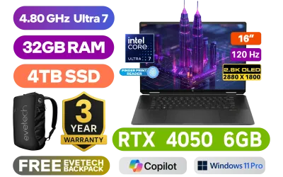 [TOUCHSCREEN] HP Spectre x360 2-in-1 Laptop 16-aa0004ni Intel® Core™ Ultra 7-155H up to 4.80GHz Processor, 24MB Cache, 16x Cores, 22x Threads / 32GB LPDDR5X RAM / 4TB Ultra-Fast NVMe SSD / 16" 2.8K (2880 x 1800) OLED, 120Hz, Micro-edge IPS Touchscreen Display / NVIDIA GeForce RTX 4050 6GB GDDR6 Dedicated Graphics / <span style="font-size: 20px; color: #00BFFF; font-weight: bold;">Windows 11 Professional (64bit)</span> / Dual Band Wi-Fi 7 BE200 Wireless LAN / Bluetooth 5.4 / HP Wide Vision 9MP IR camera with camera shutter, temporal noise reduction and integrated dual array digital microphones / 1x USB Type-A / 2x USB Type-C (USB Power Delivery, DisplayPort™ 2.1, HP Sleep and Charge) / 1x HDMI / FINGERPRINT READER / 1x Headphone and Microphone Combo Jack / No DVD Drive Included / White Backlit Keyboard / Audio by DTS:X® Ultra HP Audio Boost / FREE HP Tilt Pen / HP Spectre x360 2-in-1 Intel® Core™ Ultra 7 Touchscreen Laptop Deal[TOUCHSCREEN] HP Spectre x360 2-in-1 Laptop 16-aa0004ni Intel® Core™ Ultra 7-155H up to 4.80GHz Processor, 24MB Cache, 16x Cores, 22x Threads / 32GB LPDDR5X RAM / 4TB Ultra-Fast NVMe SSD / 16" 2.8K (2880 x 1800) OLED, 120Hz, Micro-edge IPS Touchscreen Display / NVIDIA GeForce RTX 4050 6GB GDDR6 Dedicated Graphics / Windows 11 Professional (64bit) / Dual Band Wi-Fi 7 BE200 Wireless LAN / Bluetooth 5.4 / HP Wide Vision 9MP IR camera with camera shutter, temporal noise reduction and integrated dual array digital microphones / 1x USB Type-A / 2x USB Type-C (USB Power Delivery, DisplayPort™ 2.1, HP Sleep and Charge) / 1x HDMI / FINGERPRINT READER / 1x Headphone and Microphone Combo Jack / No DVD Drive Included / White Backlit Keyboard / Audio by DTS:X® Ultra HP Audio Boost / FREE HP Tilt Pen / HP Spectre x360 2-in-1 Intel® Core™ Ultra 7 Touchscreen Laptop Deal [A5KS5EA/4TB] / 3 YEARS WARRANTY / [+] GET FREE EVETECH NEO Premium Gaming Backpack+ FREE DELIVERY !