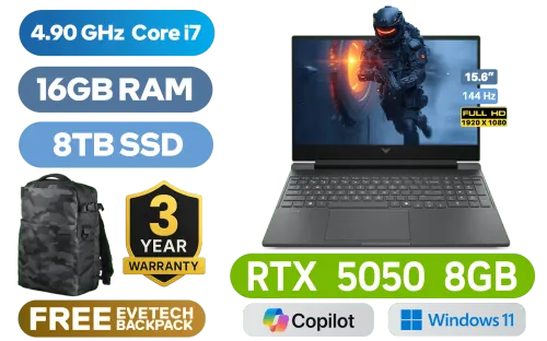 Victus by HP Gaming Laptop 15-fa2014ni 13th Gen Intel® Core™ i7-13620H up to 4.90GHz Processor, 24MB Cache, 10x Cores, 16x Threads / 16GB DDR5 RAM / 8TB Ultra-Fast NVME SSD / 15.6" FHD (1920x1080) 144Hz IPS-Level Display / NVIDIA GeForce RTX 5050 8GB GDDR7 Dedicated Graphics / Windows 11 Home 64bit / Realtek Wi-Fi 6 8852BE Wireless LAN / Bluetooth 5.4 / 720p HD Camera / 2x USB Type-A / 1x USB Type-C (Supports Power Delivery 3.1, DisplayPort 1.4a) / 1x HDMI / 1x Headphone and Microphone Combo Jack / 1x RJ45 / White Backlit Keyboard / Dual speakers with HP Audio Boost / HP Victus 15 Intel Core i7 RTX 5050 Gaming Laptop DealVictus by HP Gaming Laptop 15-fa2014ni 13th Gen Intel® Core™ i7-13620H up to 4.90GHz Processor, 24MB Cache, 10x Cores, 16x Threads / 16GB DDR5 RAM / 8TB Ultra-Fast NVME SSD / 15.6" FHD (1920x1080) 144Hz IPS-Level Display / NVIDIA GeForce RTX 5050 8GB GDDR7 Dedicated Graphics / Windows 11 Home 64bit / Realtek Wi-Fi 6 8852BE Wireless LAN / Bluetooth 5.4 / 720p HD Camera / 2x USB Type-A / 1x USB Type-C (Supports Power Delivery 3.1, DisplayPort 1.4a) / 1x HDMI / 1x Headphone and Microphone Combo Jack / 1x RJ45 / White Backlit Keyboard / Dual speakers with HP Audio Boost / HP Victus 15 Intel Core i7 RTX 5050 Gaming Laptop Deal [CF8W2EA/8TB] / 3 YEARS WARRANTY / [+] GET FREE EVETECH DASH Premium Gaming Backpack+ FREE DELIVERY !