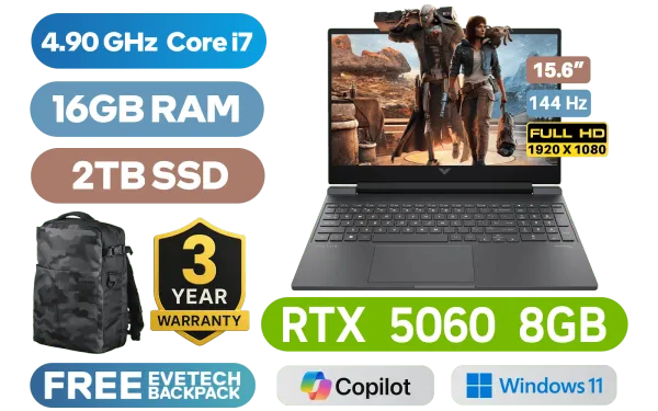 Victus by HP Gaming Laptop 15-fa2005ni 13th Gen Intel® Core™ i7-13620H up to 4.90GHz Processor, 24MB Cache, 10x Cores, 16x Threads / 16GB DDR5 RAM / 2TB Ultra-Fast NVME SSD / 15.6" FHD (1920x1080) Anti-glare 144Hz Refresh Rate with IPS-Level micro-edge Display / NVIDIA GeForce RTX 5060 8GB GDDR7 Dedicated Graphics / Windows 11 Home 64bit / Realtek Wi-Fi 6 8852BE Wireless LAN / Bluetooth 5.4 / HP Wide Vision 720p Camera with Integrated Dual Array Digital Microphone / 2x USB Type-A / 1x USB Type-C / 1x HDMI 2.1 / 1x Headphone and Microphone Combo Jack / 1x RJ45 / White Backlit Keyboard / DTS:X® Ultra; Dual speakers; HP Audio Boost / HP Victus 15 Intel Core i7 RTX 5060 Gaming Laptop DealVictus by HP Gaming Laptop 15-fa2005ni 13th Gen Intel® Core™ i7-13620H up to 4.90GHz Processor, 24MB Cache, 10x Cores, 16x Threads / 16GB DDR5 RAM / 2TB Ultra-Fast NVME SSD / 15.6" FHD (1920x1080) Anti-glare 144Hz Refresh Rate with IPS-Level micro-edge Display / NVIDIA GeForce RTX 5060 8GB GDDR7 Dedicated Graphics / Windows 11 Home 64bit / Realtek Wi-Fi 6 8852BE Wireless LAN / Bluetooth 5.4 / HP Wide Vision 720p Camera with Integrated Dual Array Digital Microphone / 2x USB Type-A / 1x USB Type-C / 1x HDMI 2.1 / 1x Headphone and Microphone Combo Jack / 1x RJ45 / White Backlit Keyboard / DTS:X® Ultra; Dual speakers; HP Audio Boost / HP Victus 15 Intel Core i7 RTX 5060 Gaming Laptop Deal [BP5P9EA/2TB] / 3 YEARS WARRANTY / [+] GET FREE EVETECH DASH Premium Gaming Backpack+ FREE DELIVERY !
