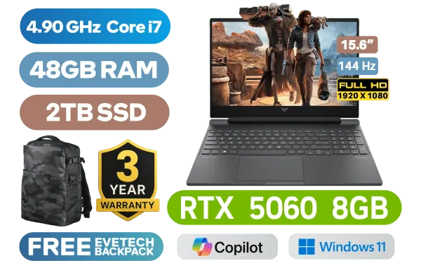 Victus by HP Gaming Laptop 15-fa2005ni 13th Gen Intel® Core™ i7-13620H up to 4.90GHz Processor, 24MB Cache, 10x Cores, 16x Threads / 48GB DDR5 RAM / 2TB Ultra-Fast NVME SSD / 15.6" FHD (1920x1080) Anti-glare 144Hz Refresh Rate with IPS-Level micro-edge Display / NVIDIA GeForce RTX 5060 8GB GDDR7 Dedicated Graphics / Windows 11 Home 64bit / Realtek Wi-Fi 6 8852BE Wireless LAN / Bluetooth 5.4 / HP Wide Vision 720p Camera with Integrated Dual Array Digital Microphone / 2x USB Type-A / 1x USB Type-C / 1x HDMI 2.1 / 1x Headphone and Microphone Combo Jack / 1x RJ45 / White Backlit Keyboard / DTS:X® Ultra; Dual speakers; HP Audio Boost / HP Victus 15 Intel Core i7 RTX 5060 Gaming Laptop DealVictus by HP Gaming Laptop 15-fa2005ni 13th Gen Intel® Core™ i7-13620H up to 4.90GHz Processor, 24MB Cache, 10x Cores, 16x Threads / 48GB DDR5 RAM / 2TB Ultra-Fast NVME SSD / 15.6" FHD (1920x1080) Anti-glare 144Hz Refresh Rate with IPS-Level micro-edge Display / NVIDIA GeForce RTX 5060 8GB GDDR7 Dedicated Graphics / Windows 11 Home 64bit / Realtek Wi-Fi 6 8852BE Wireless LAN / Bluetooth 5.4 / HP Wide Vision 720p Camera with Integrated Dual Array Digital Microphone / 2x USB Type-A / 1x USB Type-C / 1x HDMI 2.1 / 1x Headphone and Microphone Combo Jack / 1x RJ45 / White Backlit Keyboard / DTS:X® Ultra; Dual speakers; HP Audio Boost / HP Victus 15 Intel Core i7 RTX 5060 Gaming Laptop Deal [BP5P9EA/48GB/2TB] / 3 YEARS WARRANTY / [+] GET FREE EVETECH DASH Premium Gaming Backpack+ FREE DELIVERY !