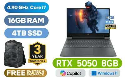 Victus by HP Gaming Laptop 15-fa2014ni 13th Gen Intel® Core™ i7-13620H up to 4.90GHz Processor, 24MB Cache, 10x Cores, 16x Threads / 16GB DDR5 RAM / 4TB Ultra-Fast NVME SSD / 15.6" FHD (1920x1080) 144Hz IPS-Level Display / NVIDIA GeForce RTX 5050 8GB GDDR7 Dedicated Graphics / Windows 11 Home 64bit / Realtek Wi-Fi 6 8852BE Wireless LAN / Bluetooth 5.4 / 720p HD Camera / 2x USB Type-A / 1x USB Type-C (Supports Power Delivery 3.1, DisplayPort 1.4a) / 1x HDMI / 1x Headphone and Microphone Combo Jack / 1x RJ45 / White Backlit Keyboard / Dual speakers with HP Audio Boost / HP Victus 15 Intel Core i7 RTX 5050 Gaming Laptop DealVictus by HP Gaming Laptop 15-fa2014ni 13th Gen Intel® Core™ i7-13620H up to 4.90GHz Processor, 24MB Cache, 10x Cores, 16x Threads / 16GB DDR5 RAM / 4TB Ultra-Fast NVME SSD / 15.6" FHD (1920x1080) 144Hz IPS-Level Display / NVIDIA GeForce RTX 5050 8GB GDDR7 Dedicated Graphics / Windows 11 Home 64bit / Realtek Wi-Fi 6 8852BE Wireless LAN / Bluetooth 5.4 / 720p HD Camera / 2x USB Type-A / 1x USB Type-C (Supports Power Delivery 3.1, DisplayPort 1.4a) / 1x HDMI / 1x Headphone and Microphone Combo Jack / 1x RJ45 / White Backlit Keyboard / Dual speakers with HP Audio Boost / HP Victus 15 Intel Core i7 RTX 5050 Gaming Laptop Deal [CF8W2EA/4TB] / 3 YEARS WARRANTY / [+] GET FREE EVETECH DASH Premium Gaming Backpack+ FREE DELIVERY !