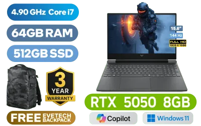 Victus by HP Gaming Laptop 15-fa2014ni 13th Gen Intel® Core™ i7-13620H up to 4.90GHz Processor, 24MB Cache, 10x Cores, 16x Threads / 64GB DDR5 RAM / 512GB Ultra-Fast NVME SSD / 15.6" FHD (1920x1080) 144Hz IPS-Level Display / NVIDIA GeForce RTX 5050 8GB GDDR7 Dedicated Graphics / Windows 11 Home 64bit / Realtek Wi-Fi 6 8852BE Wireless LAN / Bluetooth 5.4 / 720p HD Camera / 2x USB Type-A / 1x USB Type-C (Supports Power Delivery 3.1, DisplayPort 1.4a) / 1x HDMI / 1x Headphone and Microphone Combo Jack / 1x RJ45 / White Backlit Keyboard / Dual speakers with HP Audio Boost / HP Victus 15 Intel Core i7 RTX 5050 Gaming Laptop DealVictus by HP Gaming Laptop 15-fa2014ni 13th Gen Intel® Core™ i7-13620H up to 4.90GHz Processor, 24MB Cache, 10x Cores, 16x Threads / 64GB DDR5 RAM / 512GB Ultra-Fast NVME SSD / 15.6" FHD (1920x1080) 144Hz IPS-Level Display / NVIDIA GeForce RTX 5050 8GB GDDR7 Dedicated Graphics / Windows 11 Home 64bit / Realtek Wi-Fi 6 8852BE Wireless LAN / Bluetooth 5.4 / 720p HD Camera / 2x USB Type-A / 1x USB Type-C (Supports Power Delivery 3.1, DisplayPort 1.4a) / 1x HDMI / 1x Headphone and Microphone Combo Jack / 1x RJ45 / White Backlit Keyboard / Dual speakers with HP Audio Boost / HP Victus 15 Intel Core i7 RTX 5050 Gaming Laptop Deal [CF8W2EA/64GB] / 3 YEARS WARRANTY / [+] GET FREE EVETECH DASH Premium Gaming Backpack+ FREE DELIVERY !