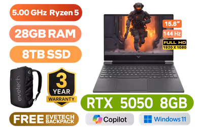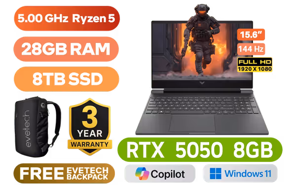 HP Victus 15-FB3029NI Laptop AMD Ryzen 5 240 up to 5.00 GHz Processor, 22MB Cache, 6x Cores, 12x Threads / 28GB DDR5 RAM / 8TB Ultra-Fast NVME SSD / 15.6" FHD (1920x1080) 144Hz Anti-glare IPS-Level Display / NVIDIA GeForce RTX 5050 8GB GDDR7 Dedicated Graphics / Windows 11 Home 64bit / Realtek RTL8852BE-VT WiFi 6 Wireless LAN / Bluetooth 5.4 / HP Wide Vision 720p HD Camera / 2x USB Type-A / 1x USB Type-C (with Power Delivery and DisplayPort) / 1x HDMI 2.1 / 1x Headphone and Microphone Combo Jack / 1x RJ45 Port / White Backlit Keyboard / Dual Speakers with DTS:X® Ultra / HP Victus Ryzen 5 RTX 5050 Gaming Laptop DealHP Victus 15-FB3029NI Laptop AMD Ryzen 5 240 up to 5.00 GHz Processor, 22MB Cache, 6x Cores, 12x Threads / 28GB DDR5 RAM / 8TB Ultra-Fast NVME SSD / 15.6" FHD (1920x1080) 144Hz Anti-glare IPS-Level Display / NVIDIA GeForce RTX 5050 8GB GDDR7 Dedicated Graphics / Windows 11 Home 64bit / Realtek RTL8852BE-VT WiFi 6 Wireless LAN / Bluetooth 5.4 / HP Wide Vision 720p HD Camera / 2x USB Type-A / 1x USB Type-C (with Power Delivery and DisplayPort) / 1x HDMI 2.1 / 1x Headphone and Microphone Combo Jack / 1x RJ45 Port / White Backlit Keyboard / Dual Speakers with DTS:X® Ultra / HP Victus Ryzen 5 RTX 5050 Gaming Laptop Deal [BP6A5EA/28GB/8TB] + FREE DELIVERY !