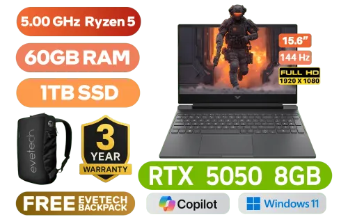 HP Victus 15-FB3029NI Laptop AMD Ryzen 5 240 up to 5.00 GHz Processor, 22MB Cache, 6x Cores, 12x Threads / 60GB DDR5 RAM / 1TB Ultra-Fast NVME SSD / 15.6" FHD (1920x1080) 144Hz Anti-glare IPS-Level Display / NVIDIA GeForce RTX 5050 8GB GDDR7 Dedicated Graphics / Windows 11 Home 64bit / Realtek RTL8852BE-VT WiFi 6 Wireless LAN / Bluetooth 5.4 / HP Wide Vision 720p HD Camera / 2x USB Type-A / 1x USB Type-C (with Power Delivery and DisplayPort) / 1x HDMI 2.1 / 1x Headphone and Microphone Combo Jack / 1x RJ45 Port / White Backlit Keyboard / Dual Speakers with DTS:X® Ultra / HP Victus Ryzen 5 RTX 5050 Gaming Laptop DealHP Victus 15-FB3029NI Laptop AMD Ryzen 5 240 up to 5.00 GHz Processor, 22MB Cache, 6x Cores, 12x Threads / 60GB DDR5 RAM / 1TB Ultra-Fast NVME SSD / 15.6" FHD (1920x1080) 144Hz Anti-glare IPS-Level Display / NVIDIA GeForce RTX 5050 8GB GDDR7 Dedicated Graphics / Windows 11 Home 64bit / Realtek RTL8852BE-VT WiFi 6 Wireless LAN / Bluetooth 5.4 / HP Wide Vision 720p HD Camera / 2x USB Type-A / 1x USB Type-C (with Power Delivery and DisplayPort) / 1x HDMI 2.1 / 1x Headphone and Microphone Combo Jack / 1x RJ45 Port / White Backlit Keyboard / Dual Speakers with DTS:X® Ultra / HP Victus Ryzen 5 RTX 5050 Gaming Laptop Deal [BP6A5EA/60GB] / [+] GET FREE EVETECH NEO Premium Gaming Backpack / 3 YEARS WARRANTY + FREE DELIVERY !