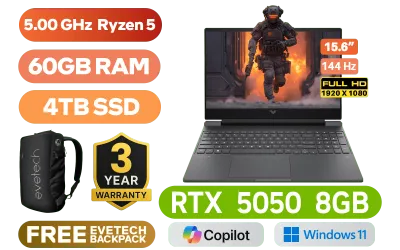 HP Victus 15-FB3029NI Laptop AMD Ryzen 5 240 up to 5.00 GHz Processor, 22MB Cache, 6x Cores, 12x Threads / 60GB DDR5 RAM / 4TB Ultra-Fast NVME SSD / 15.6" FHD (1920x1080) 144Hz Anti-glare IPS-Level Display / NVIDIA GeForce RTX 5050 8GB GDDR7 Dedicated Graphics / Windows 11 Home 64bit / Realtek RTL8852BE-VT WiFi 6 Wireless LAN / Bluetooth 5.4 / HP Wide Vision 720p HD Camera / 2x USB Type-A / 1x USB Type-C (with Power Delivery and DisplayPort) / 1x HDMI 2.1 / 1x Headphone and Microphone Combo Jack / 1x RJ45 Port / White Backlit Keyboard / Dual Speakers with DTS:X® Ultra / HP Victus Ryzen 5 RTX 5050 Gaming Laptop DealHP Victus 15-FB3029NI Laptop AMD Ryzen 5 240 up to 5.00 GHz Processor, 22MB Cache, 6x Cores, 12x Threads / 60GB DDR5 RAM / 4TB Ultra-Fast NVME SSD / 15.6" FHD (1920x1080) 144Hz Anti-glare IPS-Level Display / NVIDIA GeForce RTX 5050 8GB GDDR7 Dedicated Graphics / Windows 11 Home 64bit / Realtek RTL8852BE-VT WiFi 6 Wireless LAN / Bluetooth 5.4 / HP Wide Vision 720p HD Camera / 2x USB Type-A / 1x USB Type-C (with Power Delivery and DisplayPort) / 1x HDMI 2.1 / 1x Headphone and Microphone Combo Jack / 1x RJ45 Port / White Backlit Keyboard / Dual Speakers with DTS:X® Ultra / HP Victus Ryzen 5 RTX 5050 Gaming Laptop Deal [BP6A5EA/60GB/4TB] / [+] GET FREE EVETECH NEO Premium Gaming Backpack / 3 YEARS WARRANTY + FREE DELIVERY !