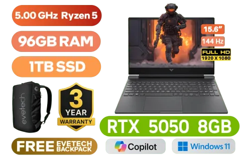 HP Victus 15-FB3029NI Laptop AMD Ryzen 5 240 up to 5.00 GHz Processor, 22MB Cache, 6x Cores, 12x Threads / 96GB DDR5 RAM / 1TB Ultra-Fast NVME SSD / 15.6" FHD (1920x1080) 144Hz Anti-glare IPS-Level Display / NVIDIA GeForce RTX 5050 8GB GDDR7 Dedicated Graphics / Windows 11 Home 64bit / Realtek RTL8852BE-VT WiFi 6 Wireless LAN / Bluetooth 5.4 / HP Wide Vision 720p HD Camera / 2x USB Type-A / 1x USB Type-C (with Power Delivery and DisplayPort) / 1x HDMI 2.1 / 1x Headphone and Microphone Combo Jack / 1x RJ45 Port / White Backlit Keyboard / Dual Speakers with DTS:X® Ultra / HP Victus Ryzen 5 RTX 5050 Gaming Laptop DealHP Victus 15-FB3029NI Laptop AMD Ryzen 5 240 up to 5.00 GHz Processor, 22MB Cache, 6x Cores, 12x Threads / 96GB DDR5 RAM / 1TB Ultra-Fast NVME SSD / 15.6" FHD (1920x1080) 144Hz Anti-glare IPS-Level Display / NVIDIA GeForce RTX 5050 8GB GDDR7 Dedicated Graphics / Windows 11 Home 64bit / Realtek RTL8852BE-VT WiFi 6 Wireless LAN / Bluetooth 5.4 / HP Wide Vision 720p HD Camera / 2x USB Type-A / 1x USB Type-C (with Power Delivery and DisplayPort) / 1x HDMI 2.1 / 1x Headphone and Microphone Combo Jack / 1x RJ45 Port / White Backlit Keyboard / Dual Speakers with DTS:X® Ultra / HP Victus Ryzen 5 RTX 5050 Gaming Laptop Deal [BP6A5EA/96GB] + FREE DELIVERY !
