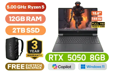HP Victus 15-FB3029NI Laptop AMD Ryzen 5 240 up to 5.00 GHz Processor, 22MB Cache, 6x Cores, 12x Threads / 12GB DDR5 RAM / 2TB Ultra-Fast NVME SSD / 15.6" FHD (1920x1080) 144Hz Anti-glare IPS-Level Display / NVIDIA GeForce RTX 5050 8GB GDDR7 Dedicated Graphics / Windows 11 Home 64bit / Realtek RTL8852BE-VT WiFi 6 Wireless LAN / Bluetooth 5.4 / HP Wide Vision 720p HD Camera / 2x USB Type-A / 1x USB Type-C (with Power Delivery and DisplayPort) / 1x HDMI 2.1 / 1x Headphone and Microphone Combo Jack / 1x RJ45 Port / White Backlit Keyboard / Dual Speakers with DTS:X® Ultra / HP Victus Ryzen 5 RTX 5050 Gaming Laptop DealHP Victus 15-FB3029NI Laptop AMD Ryzen 5 240 up to 5.00 GHz Processor, 22MB Cache, 6x Cores, 12x Threads / 12GB DDR5 RAM / 2TB Ultra-Fast NVME SSD / 15.6" FHD (1920x1080) 144Hz Anti-glare IPS-Level Display / NVIDIA GeForce RTX 5050 8GB GDDR7 Dedicated Graphics / Windows 11 Home 64bit / Realtek RTL8852BE-VT WiFi 6 Wireless LAN / Bluetooth 5.4 / HP Wide Vision 720p HD Camera / 2x USB Type-A / 1x USB Type-C (with Power Delivery and DisplayPort) / 1x HDMI 2.1 / 1x Headphone and Microphone Combo Jack / 1x RJ45 Port / White Backlit Keyboard / Dual Speakers with DTS:X® Ultra / HP Victus Ryzen 5 RTX 5050 Gaming Laptop Deal [BP6A5EA/2TB] / [+] GET FREE EVETECH NEO Premium Gaming Backpack / 3 YEARS WARRANTY + FREE DELIVERY !
