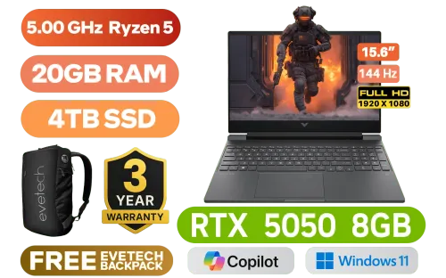 HP Victus 15-FB3029NI Laptop AMD Ryzen 5 240 up to 5.00 GHz Processor, 22MB Cache, 6x Cores, 12x Threads / 20GB DDR5 RAM / 4TB Ultra-Fast NVME SSD / 15.6" FHD (1920x1080) 144Hz Anti-glare IPS-Level Display / NVIDIA GeForce RTX 5050 8GB GDDR7 Dedicated Graphics / Windows 11 Home 64bit / Realtek RTL8852BE-VT WiFi 6 Wireless LAN / Bluetooth 5.4 / HP Wide Vision 720p HD Camera / 2x USB Type-A / 1x USB Type-C (with Power Delivery and DisplayPort) / 1x HDMI 2.1 / 1x Headphone and Microphone Combo Jack / 1x RJ45 Port / White Backlit Keyboard / Dual Speakers with DTS:X® Ultra / HP Victus Ryzen 5 RTX 5050 Gaming Laptop DealHP Victus 15-FB3029NI Laptop AMD Ryzen 5 240 up to 5.00 GHz Processor, 22MB Cache, 6x Cores, 12x Threads / 20GB DDR5 RAM / 4TB Ultra-Fast NVME SSD / 15.6" FHD (1920x1080) 144Hz Anti-glare IPS-Level Display / NVIDIA GeForce RTX 5050 8GB GDDR7 Dedicated Graphics / Windows 11 Home 64bit / Realtek RTL8852BE-VT WiFi 6 Wireless LAN / Bluetooth 5.4 / HP Wide Vision 720p HD Camera / 2x USB Type-A / 1x USB Type-C (with Power Delivery and DisplayPort) / 1x HDMI 2.1 / 1x Headphone and Microphone Combo Jack / 1x RJ45 Port / White Backlit Keyboard / Dual Speakers with DTS:X® Ultra / HP Victus Ryzen 5 RTX 5050 Gaming Laptop Deal [BP6A5EA/20GB/4TB] / [+] GET FREE EVETECH NEO Premium Gaming Backpack / 3 YEARS WARRANTY + FREE DELIVERY !