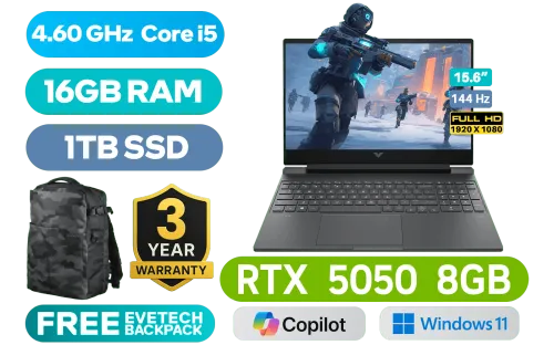 Victus by HP Gaming Laptop 15-fa2013ni 13th Gen Intel® Core™ i5-13420H up to 4.60GHz Processor, 12MB Cache, 8x Cores, 12x Threads / 16GB DDR5 RAM / 1TB Ultra-Fast NVME SSD / 15.6" FHD (1920x1080) Anti-glare 144Hz Refresh Rate with IPS-Level micro-edge Display / NVIDIA GeForce RTX 5050 8GB GDDR7 Dedicated Graphics / Windows 11 Home 64bit / Realtek Wi-Fi 6 8852BE Wireless LAN / Bluetooth 5.4 / HP Wide Vision 720p Camera with Integrated Dual Array Digital Microphone / 2x USB Type-A / 1x USB Type-C / 1x HDMI 2.1 / 1x Headphone and Microphone Combo Jack / 1x RJ45 / White Backlit Keyboard / DTS:X® Ultra; Dual speakers; HP Audio Boost / HP Victus 15 Intel Core i5 RTX 5050 Gaming Laptop DealVictus by HP Gaming Laptop 15-fa2013ni 13th Gen Intel® Core™ i5-13420H up to 4.60GHz Processor, 12MB Cache, 8x Cores, 12x Threads / 16GB DDR5 RAM / 1TB Ultra-Fast NVME SSD / 15.6" FHD (1920x1080) Anti-glare 144Hz Refresh Rate with IPS-Level micro-edge Display / NVIDIA GeForce RTX 5050 8GB GDDR7 Dedicated Graphics / Windows 11 Home 64bit / Realtek Wi-Fi 6 8852BE Wireless LAN / Bluetooth 5.4 / HP Wide Vision 720p Camera with Integrated Dual Array Digital Microphone / 2x USB Type-A / 1x USB Type-C / 1x HDMI 2.1 / 1x Headphone and Microphone Combo Jack / 1x RJ45 / White Backlit Keyboard / DTS:X® Ultra; Dual speakers; HP Audio Boost / HP Victus 15 Intel Core i5 RTX 5050 Gaming Laptop Deal [BP5Q0EA/16GB/1TB] / 3 YEARS WARRANTY / [+] GET FREE EVETECH DASH Premium Gaming Backpack+ FREE DELIVERY !