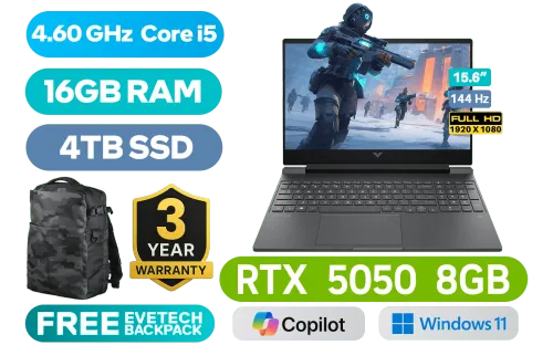 Victus by HP Gaming Laptop 15-fa2013ni 13th Gen Intel® Core™ i5-13420H up to 4.60GHz Processor, 12MB Cache, 8x Cores, 12x Threads / 16GB DDR5 RAM / 4TB Ultra-Fast NVME SSD / 15.6" FHD (1920x1080) Anti-glare 144Hz Refresh Rate with IPS-Level micro-edge Display / NVIDIA GeForce RTX 5050 8GB GDDR7 Dedicated Graphics / Windows 11 Home 64bit / Realtek Wi-Fi 6 8852BE Wireless LAN / Bluetooth 5.4 / HP Wide Vision 720p Camera with Integrated Dual Array Digital Microphone / 2x USB Type-A / 1x USB Type-C / 1x HDMI 2.1 / 1x Headphone and Microphone Combo Jack / 1x RJ45 / White Backlit Keyboard / DTS:X® Ultra; Dual speakers; HP Audio Boost / HP Victus 15 Intel Core i5 RTX 5050 Gaming Laptop DealVictus by HP Gaming Laptop 15-fa2013ni 13th Gen Intel® Core™ i5-13420H up to 4.60GHz Processor, 12MB Cache, 8x Cores, 12x Threads / 16GB DDR5 RAM / 4TB Ultra-Fast NVME SSD / 15.6" FHD (1920x1080) Anti-glare 144Hz Refresh Rate with IPS-Level micro-edge Display / NVIDIA GeForce RTX 5050 8GB GDDR7 Dedicated Graphics / Windows 11 Home 64bit / Realtek Wi-Fi 6 8852BE Wireless LAN / Bluetooth 5.4 / HP Wide Vision 720p Camera with Integrated Dual Array Digital Microphone / 2x USB Type-A / 1x USB Type-C / 1x HDMI 2.1 / 1x Headphone and Microphone Combo Jack / 1x RJ45 / White Backlit Keyboard / DTS:X® Ultra; Dual speakers; HP Audio Boost / HP Victus 15 Intel Core i5 RTX 5050 Gaming Laptop Deal [BP5Q0EA/32GB/4TB] / 3 YEARS WARRANTY / [+] GET FREE EVETECH DASH Premium Gaming Backpack+ FREE DELIVERY !
