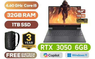 Victus by HP Laptop 15-fa1014ni Intel® Core™ i5-13420H up to 4.60GHz Processor, 12MB Cache, 8x Cores, 12x Threads / 32GB DDR4 RAM / 1TB Ultra-Fast NVME SSD / 15.6" FHD 1920x1080 144Hz Anti-glare IPS-Level Display / RTX 3050 6GB GDDR6 Dedicated Graphics / Windows 11 Home 64bit / MediaTek Wi-Fi 6 MT7921 Wireless LAN / Bluetooth 5.3 / 720p HD Camera / 2x USB Type-A / 1x USB Type-C / 1x HDMI 2.1 / 1x Headphone and Microphone Combo Jack / 1x RJ45 Ethernet LAN / 1x SD Card Reader / White Backlit Keyboard / Bang & Olufsen Dual speakers / HP Victus 15 Intel® Core™ i5 RTX 3050 Gaming Laptop DealVictus by HP Laptop 15-fa1014ni Intel® Core™ i5-13420H up to 4.60GHz Processor, 12MB Cache, 8x Cores, 12x Threads / 32GB DDR4 RAM / 1TB Ultra-Fast NVME SSD / 15.6" FHD 1920x1080 144Hz Anti-glare IPS-Level Display / RTX 3050 6GB GDDR6 Dedicated Graphics / Windows 11 Home 64bit / MediaTek Wi-Fi 6 MT7921 Wireless LAN / Bluetooth 5.3 / 720p HD Camera / 2x USB Type-A / 1x USB Type-C / 1x HDMI 2.1 / 1x Headphone and Microphone Combo Jack / 1x RJ45 Ethernet LAN / 1x SD Card Reader / White Backlit Keyboard / Bang & Olufsen Dual speakers / HP Victus 15 Intel® Core™ i5 RTX 3050 Gaming Laptop Deal [A73T6EA/32GB/1TB] / 3 YEARS WARRANTY / [+] GET FREE EVETECH NEO Premium Gaming Backpack+ FREE DELIVERY !