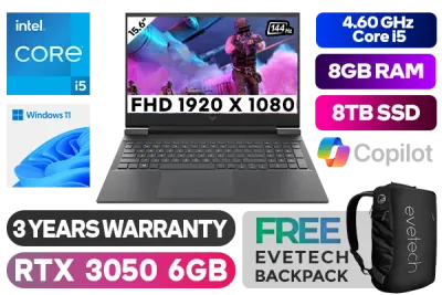 Victus by HP Laptop 15-fa1014ni Intel® Core™ i5-13420H up to 4.60GHz Processor, 12MB Cache, 8x Cores, 12x Threads / 8GB DDR4 RAM / 8TB Ultra-Fast NVME SSD / 15.6" FHD 1920x1080 144Hz Anti-glare IPS-Level Display / RTX 3050 6GB GDDR6 Dedicated Graphics / Windows 11 Home 64bit / MediaTek Wi-Fi 6 MT7921 Wireless LAN / Bluetooth 5.3 / 720p HD Camera / 2x USB Type-A / 1x USB Type-C / 1x HDMI 2.1 / 1x Headphone and Microphone Combo Jack / 1x RJ45 Ethernet LAN / 1x SD Card Reader / White Backlit Keyboard / Bang & Olufsen Dual speakers / HP Victus 15 Intel® Core™ i5 RTX 3050 Gaming Laptop DealVictus by HP Laptop 15-fa1014ni Intel® Core™ i5-13420H up to 4.60GHz Processor, 12MB Cache, 8x Cores, 12x Threads / 8GB DDR4 RAM / 8TB Ultra-Fast NVME SSD / 15.6" FHD 1920x1080 144Hz Anti-glare IPS-Level Display / RTX 3050 6GB GDDR6 Dedicated Graphics / Windows 11 Home 64bit / MediaTek Wi-Fi 6 MT7921 Wireless LAN / Bluetooth 5.3 / 720p HD Camera / 2x USB Type-A / 1x USB Type-C / 1x HDMI 2.1 / 1x Headphone and Microphone Combo Jack / 1x RJ45 Ethernet LAN / 1x SD Card Reader / White Backlit Keyboard / Bang & Olufsen Dual speakers / HP Victus 15 Intel® Core™ i5 RTX 3050 Gaming Laptop Deal [A73T6EA/8TB] / 3 YEARS WARRANTY / [+] GET FREE EVETECH NEO Premium Gaming Backpack+ FREE DELIVERY !