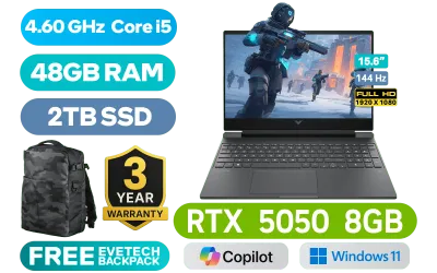 Victus by HP Gaming Laptop 15-fa2013ni 13th Gen Intel® Core™ i5-13420H up to 4.60GHz Processor, 12MB Cache, 8x Cores, 12x Threads / 48GB DDR5 RAM / 2TB Ultra-Fast NVME SSD / 15.6" FHD (1920x1080) Anti-glare 144Hz Refresh Rate with IPS-Level micro-edge Display / NVIDIA GeForce RTX 5050 8GB GDDR7 Dedicated Graphics / Windows 11 Home 64bit / Realtek Wi-Fi 6 8852BE Wireless LAN / Bluetooth 5.4 / HP Wide Vision 720p Camera with Integrated Dual Array Digital Microphone / 2x USB Type-A / 1x USB Type-C / 1x HDMI 2.1 / 1x Headphone and Microphone Combo Jack / 1x RJ45 / White Backlit Keyboard / DTS:X® Ultra; Dual speakers; HP Audio Boost / HP Victus 15 Intel Core i5 RTX 5050 Gaming Laptop DealVictus by HP Gaming Laptop 15-fa2013ni 13th Gen Intel® Core™ i5-13420H up to 4.60GHz Processor, 12MB Cache, 8x Cores, 12x Threads / 48GB DDR5 RAM / 2TB Ultra-Fast NVME SSD / 15.6" FHD (1920x1080) Anti-glare 144Hz Refresh Rate with IPS-Level micro-edge Display / NVIDIA GeForce RTX 5050 8GB GDDR7 Dedicated Graphics / Windows 11 Home 64bit / Realtek Wi-Fi 6 8852BE Wireless LAN / Bluetooth 5.4 / HP Wide Vision 720p Camera with Integrated Dual Array Digital Microphone / 2x USB Type-A / 1x USB Type-C / 1x HDMI 2.1 / 1x Headphone and Microphone Combo Jack / 1x RJ45 / White Backlit Keyboard / DTS:X® Ultra; Dual speakers; HP Audio Boost / HP Victus 15 Intel Core i5 RTX 5050 Gaming Laptop Deal [BP5Q0EA/48GB/2TB] / 3 YEARS WARRANTY / [+] GET FREE EVETECH DASH Premium Gaming Backpack+ FREE DELIVERY !